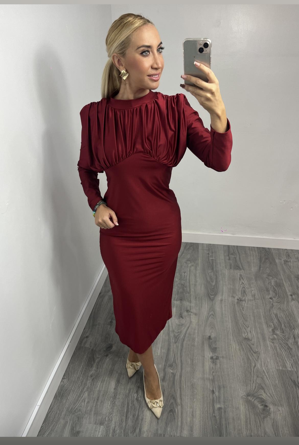 Vestido Midi Elegante con Fruncido Fronta burdeos