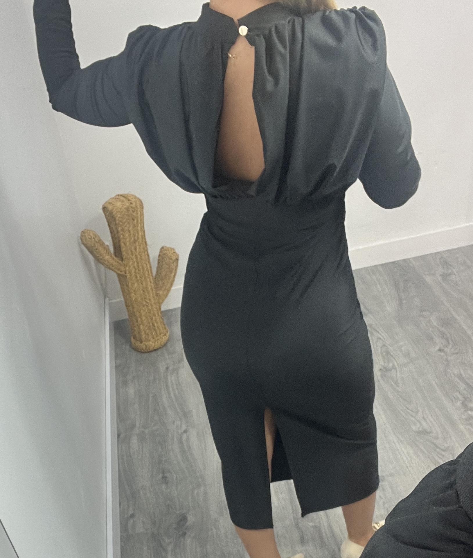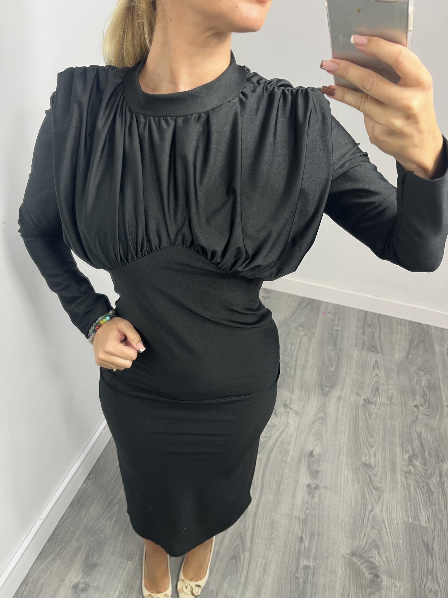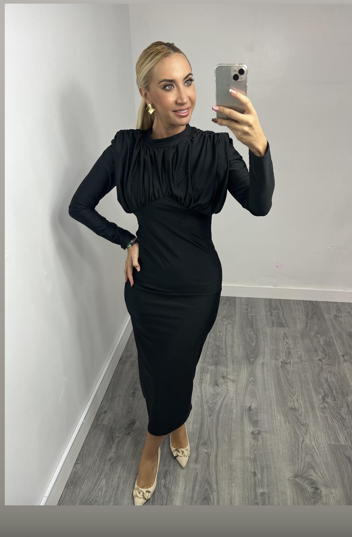 Este vestido midi negro elegante es la definición de sofisticación atemporal. Diseñado para realzar la silueta femenina, cuenta con un delicado fruncido frontal en la parte superior que aporta volumen y un toque distintivo. Su corte entallado resalta las curvas de manera sutil, mientras que la manga larga y el cuello cerrado le otorgan un aire refinado y versátil.