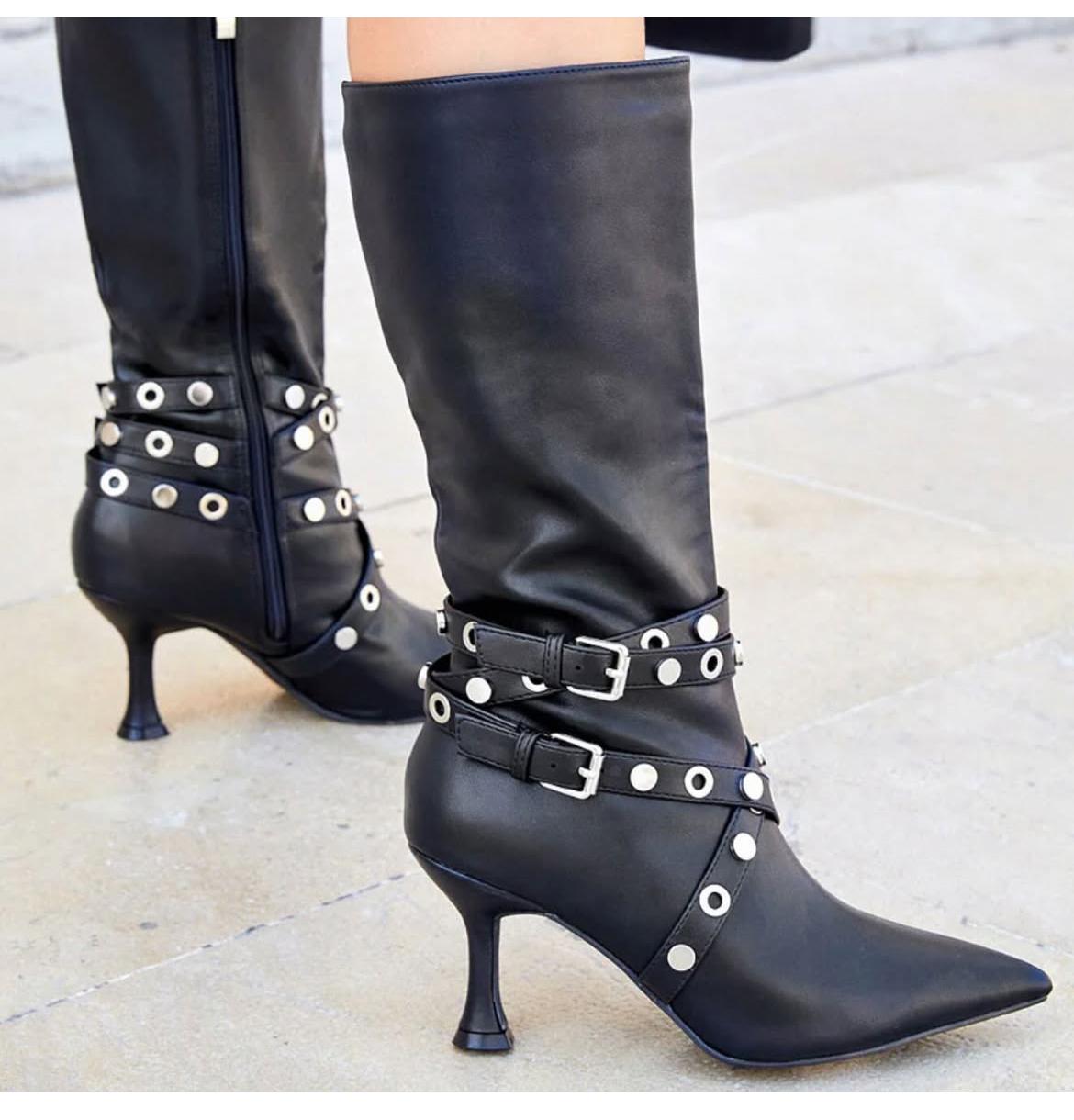 Bota alta parConfeccionadas en acabado tipo cuero de alta calidad, cuentan con un tacón fino de altura media que estiliza la figura sin perder comodidad. Los detalles de correas con hebillas plateadas aportan un toque atrevido y moderno, convirtiéndolas en las botas ideales para mujeres que quieren destacar con cada paso. Ideal para otoño invierno.