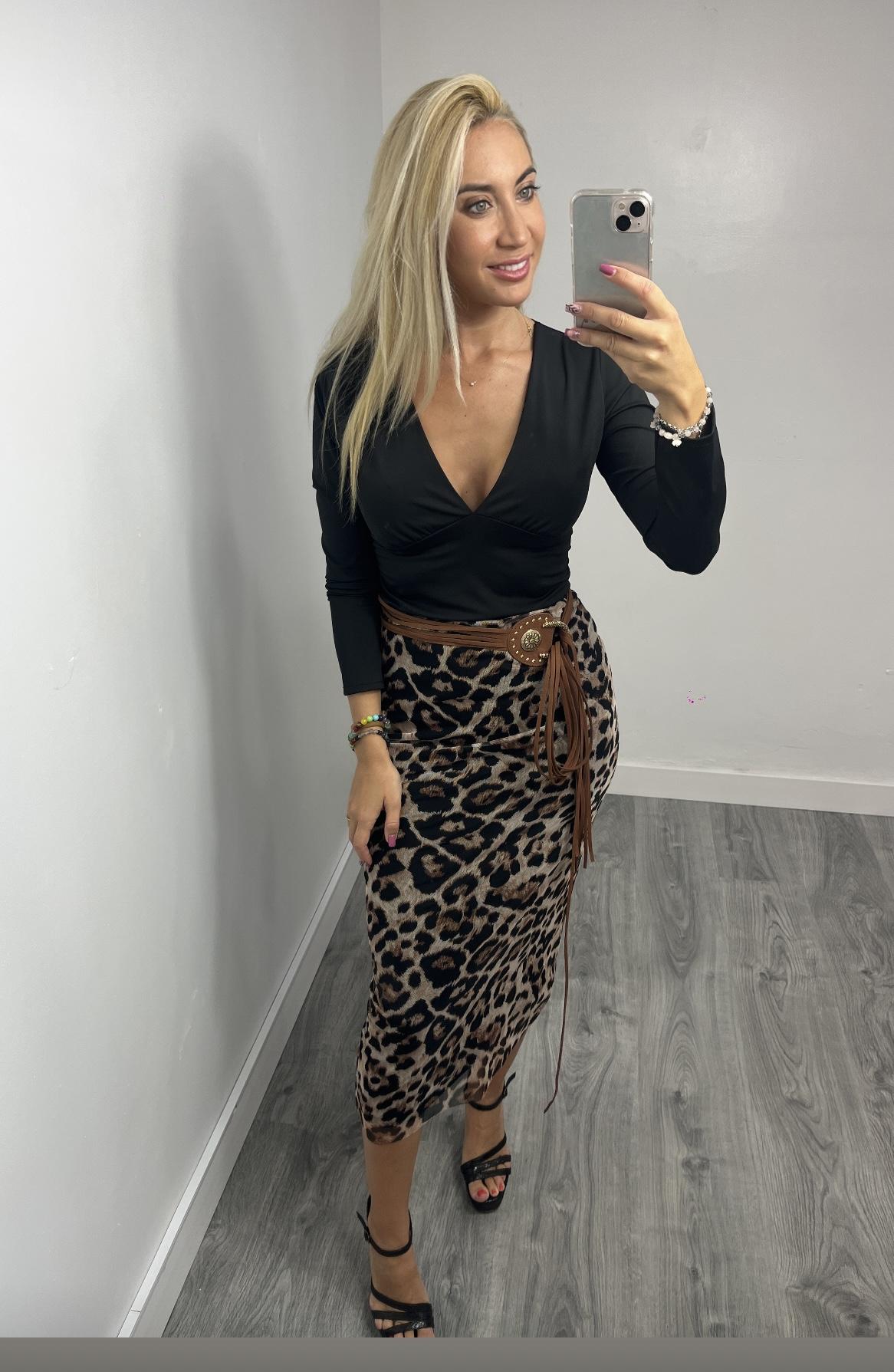 Combínala con blusas elegantes, tops básicos o camisas para un look sofisticado, o con camisetas y chaquetas de cuero para un estilo más urbano y atrevido. El animal print nunca pasa de moda, y esta falda es ideal para mujeres que buscan destacar con personalidad y feminidad.