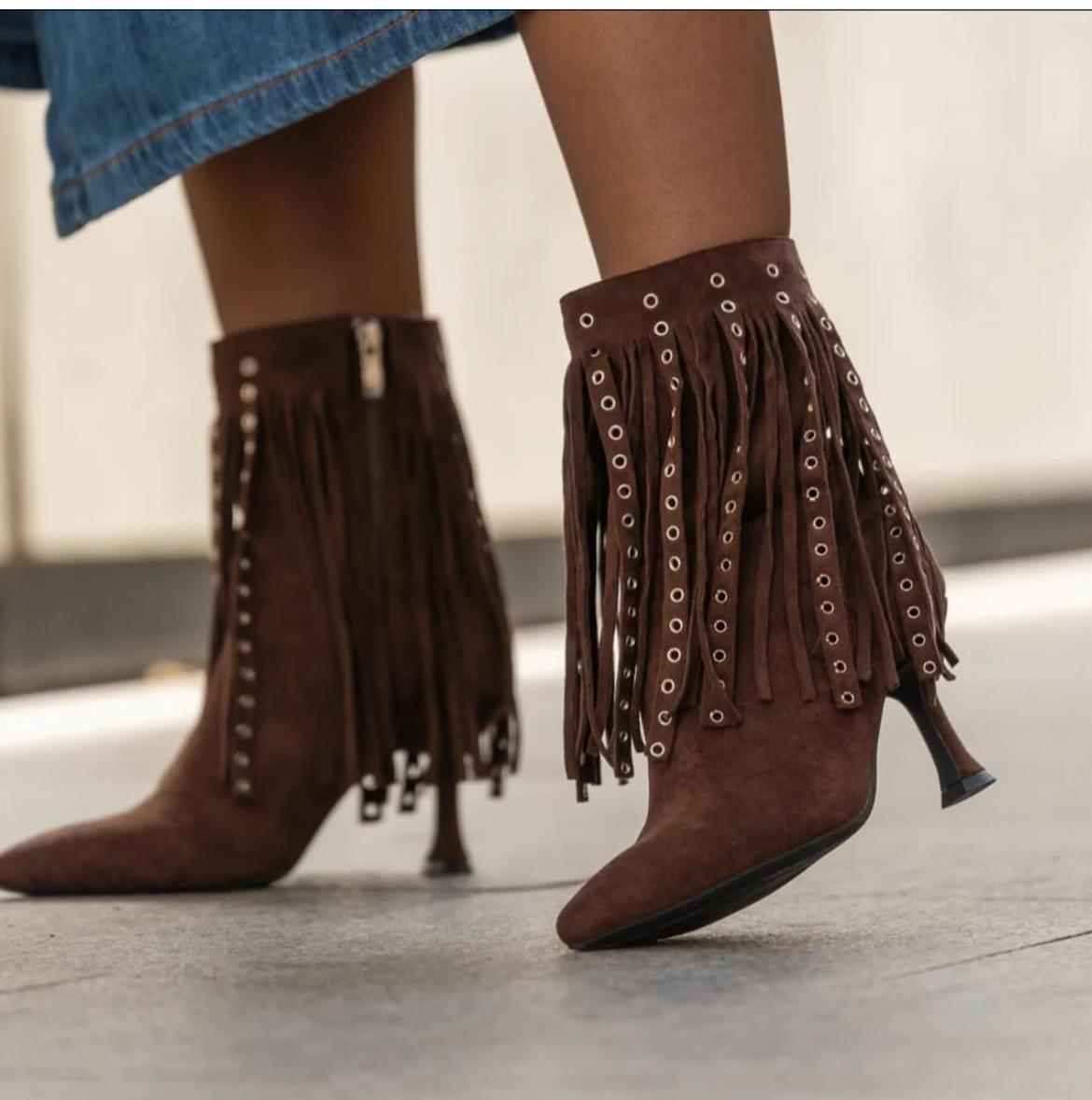 Atrévete con el toque más boho y sofisticado de la temporada con estos botines marrones con flecos.