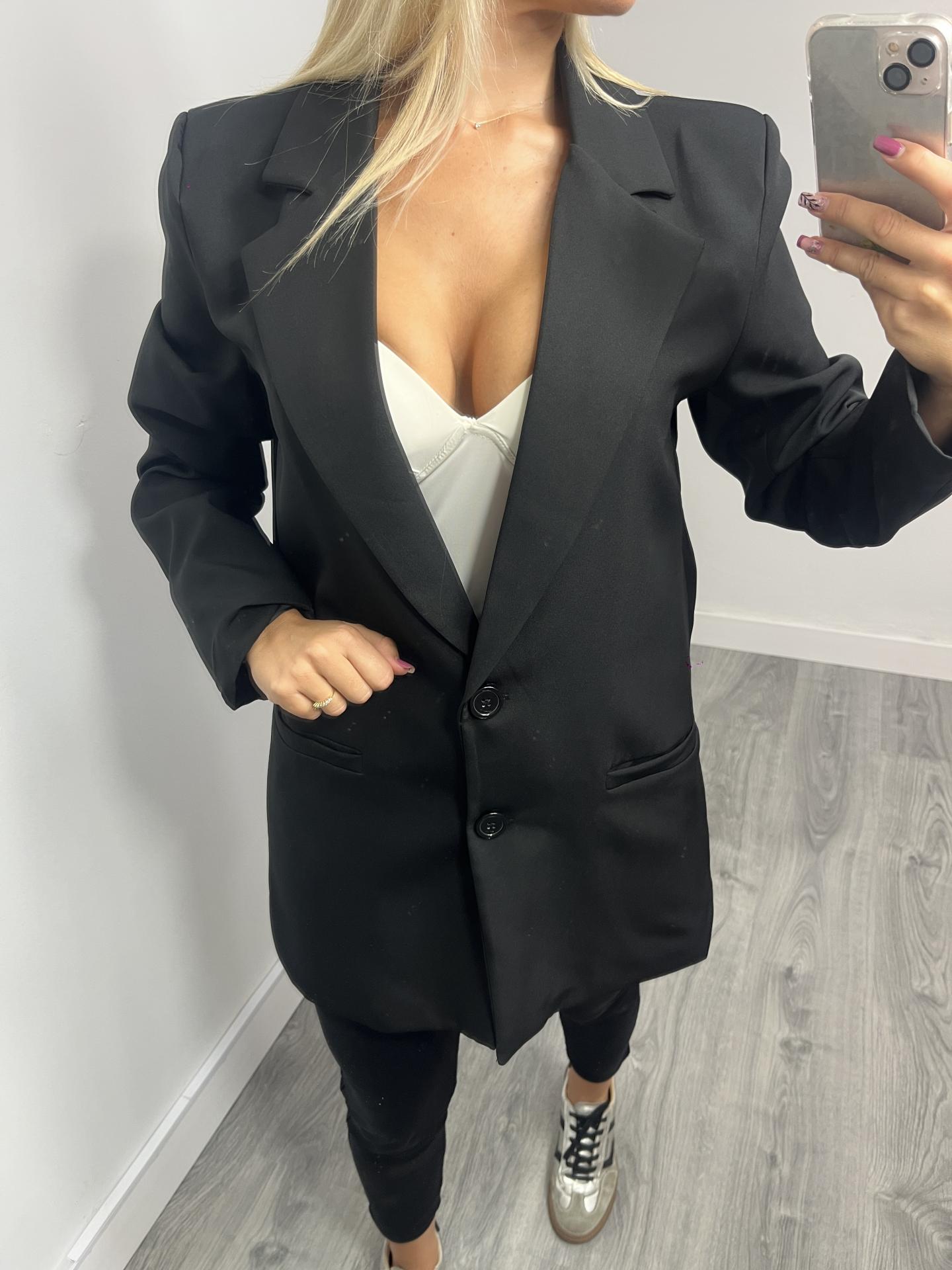 • Blazer negro de corte recto y largo medio.