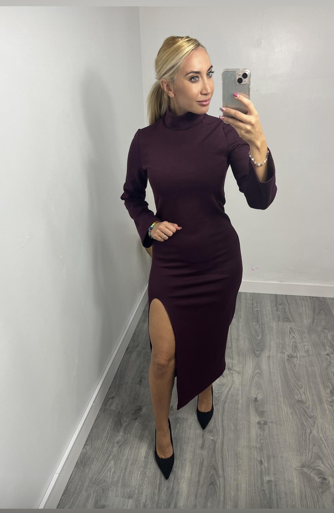 Vestido Midi Burdeos con Abertura Lateral y Cuello Alto