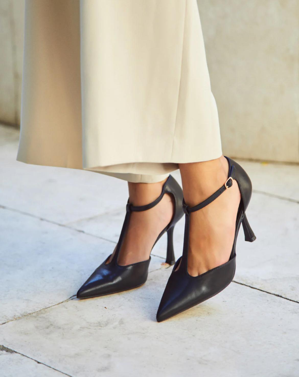 Tacones de mujer con textura tipo piel, punta fina y pulsera T-bar. Un diseño atemporal que combina elegancia y comodidad.