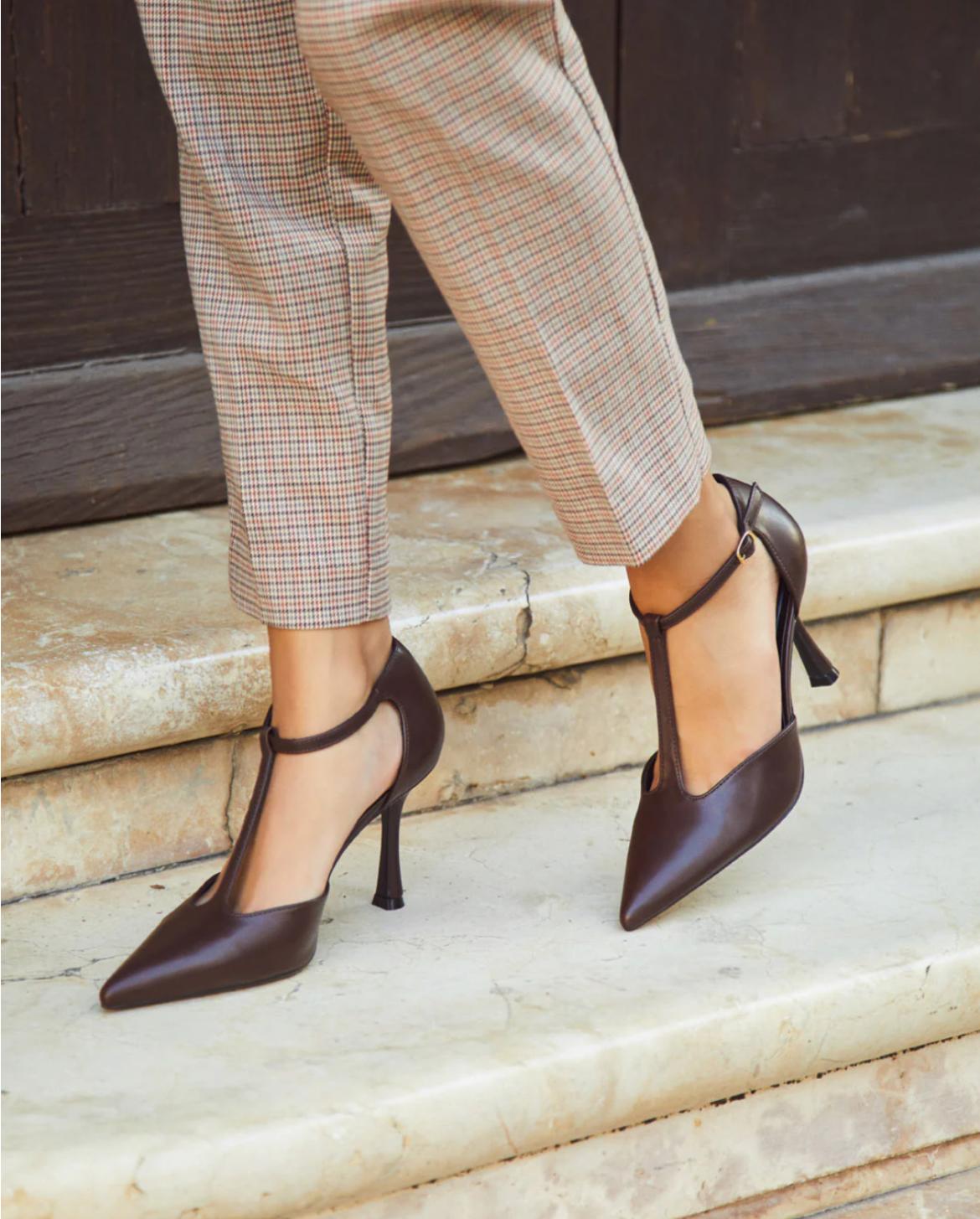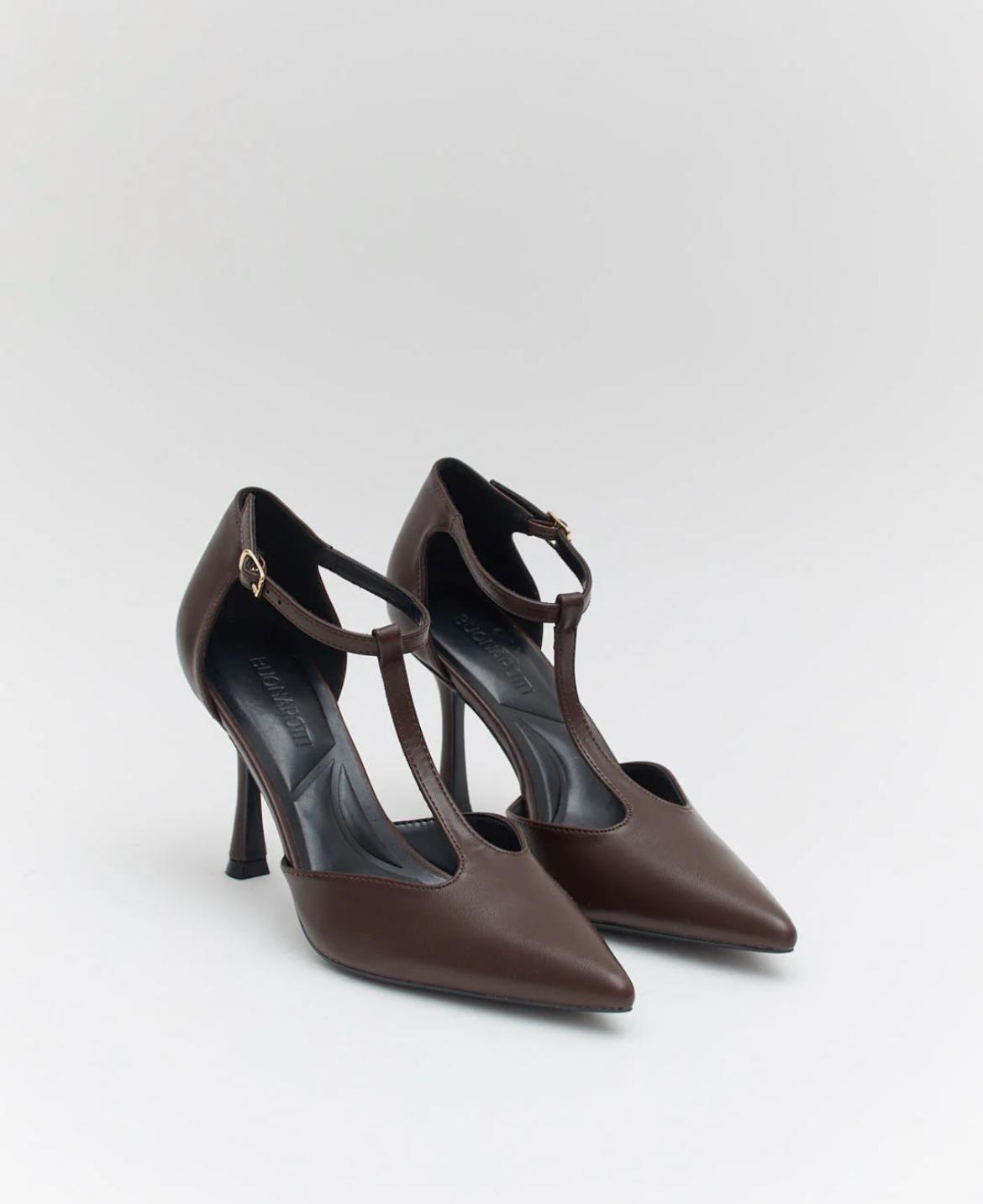 Resalta tu estilo con estos sofisticados zapatos de tacón marrón para mujer, diseñados con textura tipo piel y acabado elegante. Su forma estilizada de punta fina y la pulsera T-bar con hebilla ajustable aportan firmeza y distinción en cada paso.