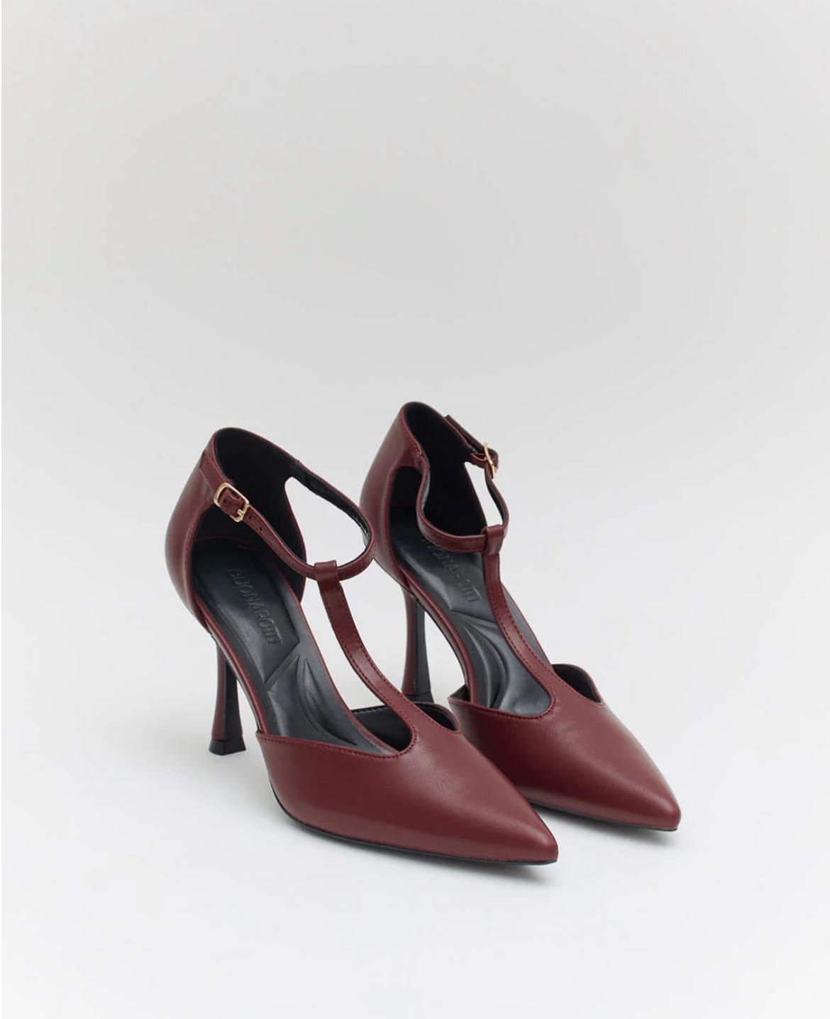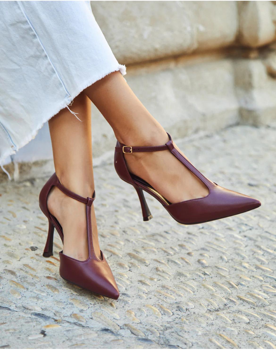 Tacones de mujer con textura tipo piel, punta fina y pulsera T-bar. Un diseño atemporal que combina elegancia y comodidad.