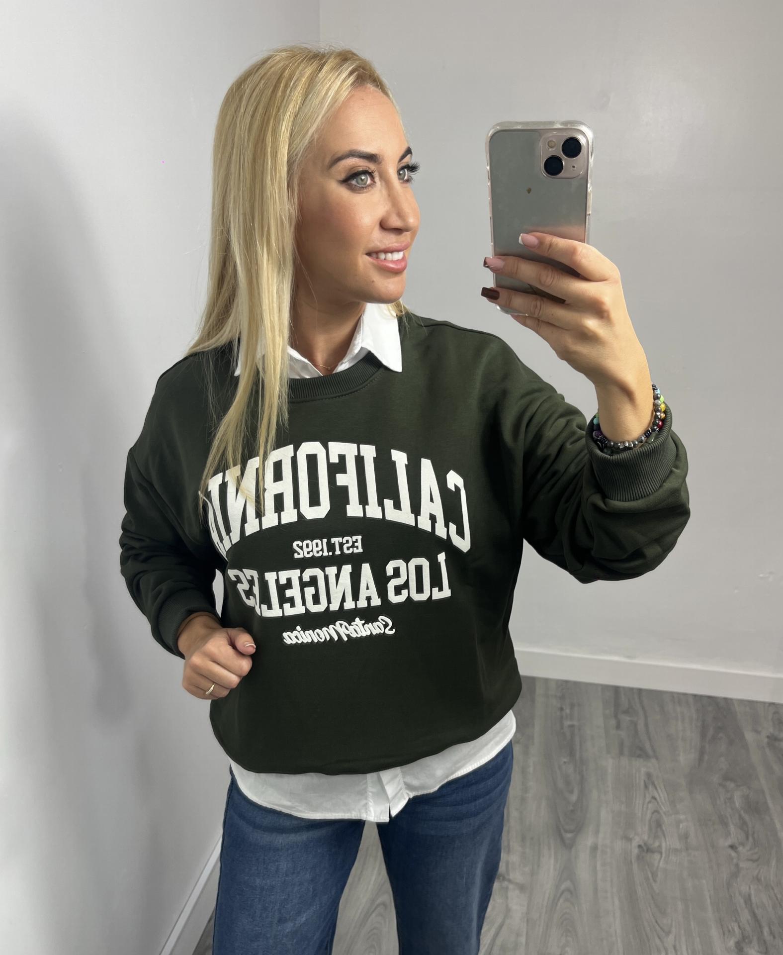 Eleva tu look con nuestra sudadera “California Los Ángeles” en color verde oscuro, una prenda que combina comodidad, estilo y tendencia. Su diseño moderno con estampado frontal universitario aporta un aire sport chic, perfecto para el día a día.