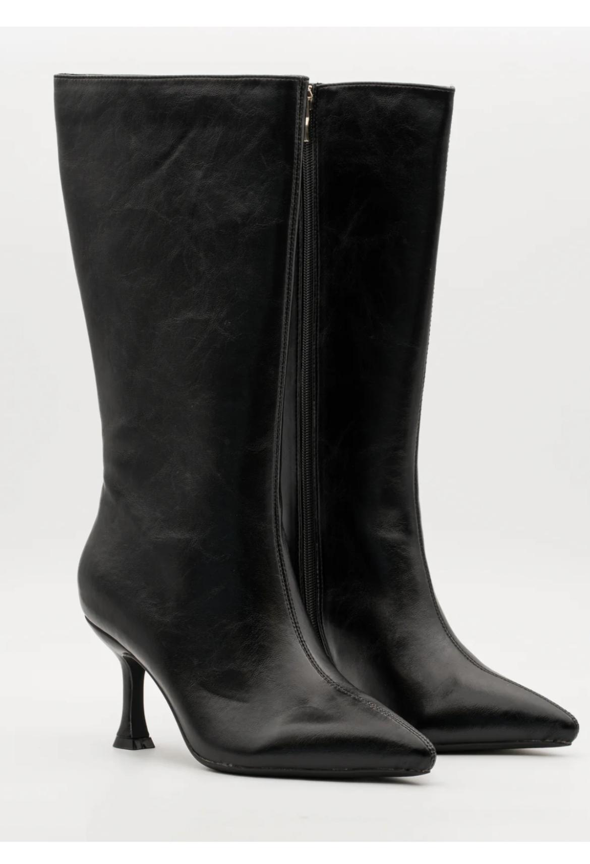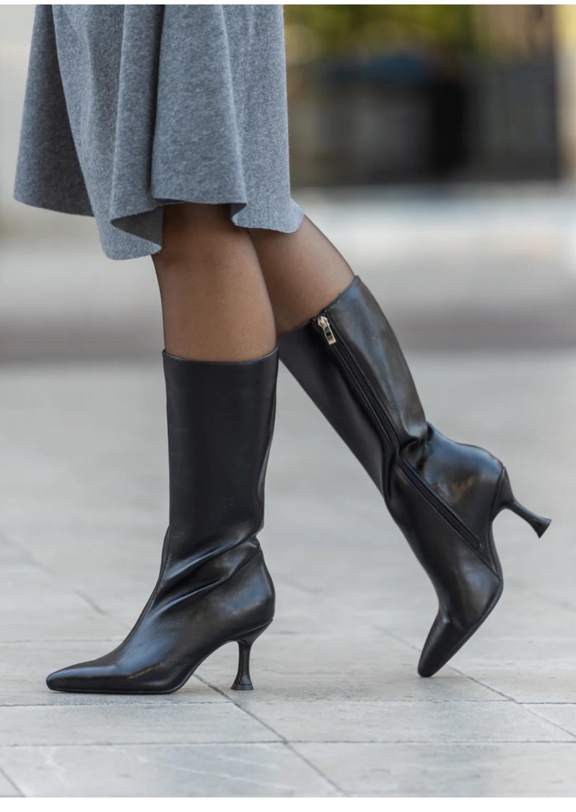 Botas negras altas con tacón fino para mujer. Diseño clásico, sofisticado y versátil. Eleva tus looks con el estilo exclusivo de Malika.