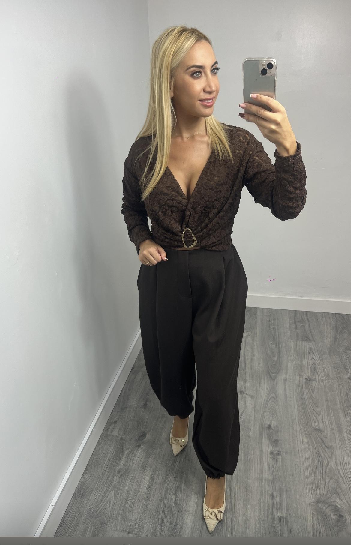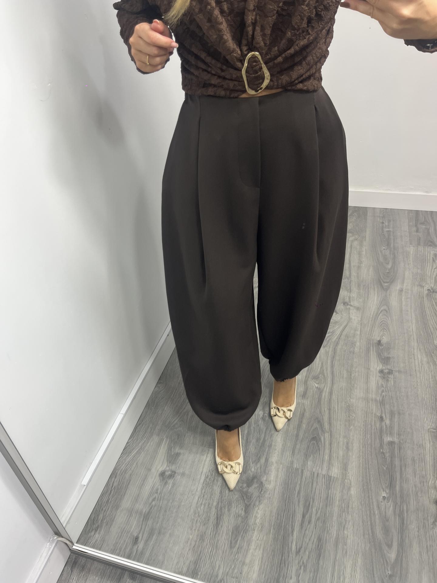 Este pantalón fluido de pinzas en tono marrón oscuro combina comodidad y estilo en una prenda versátil y atemporal. De tiro alto y pierna amplia, estiliza la figura y aporta una caída elegante que realza cualquier look.