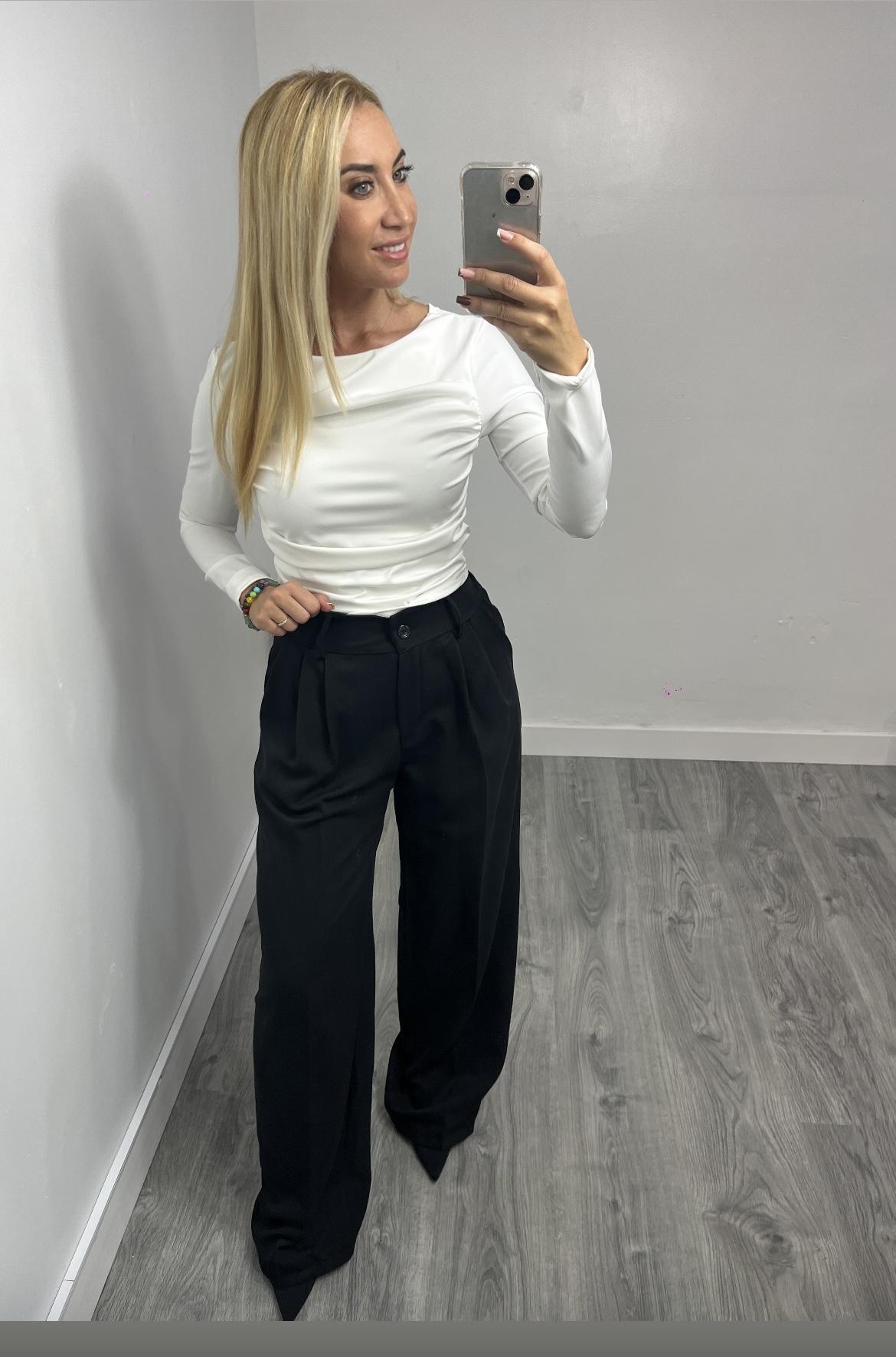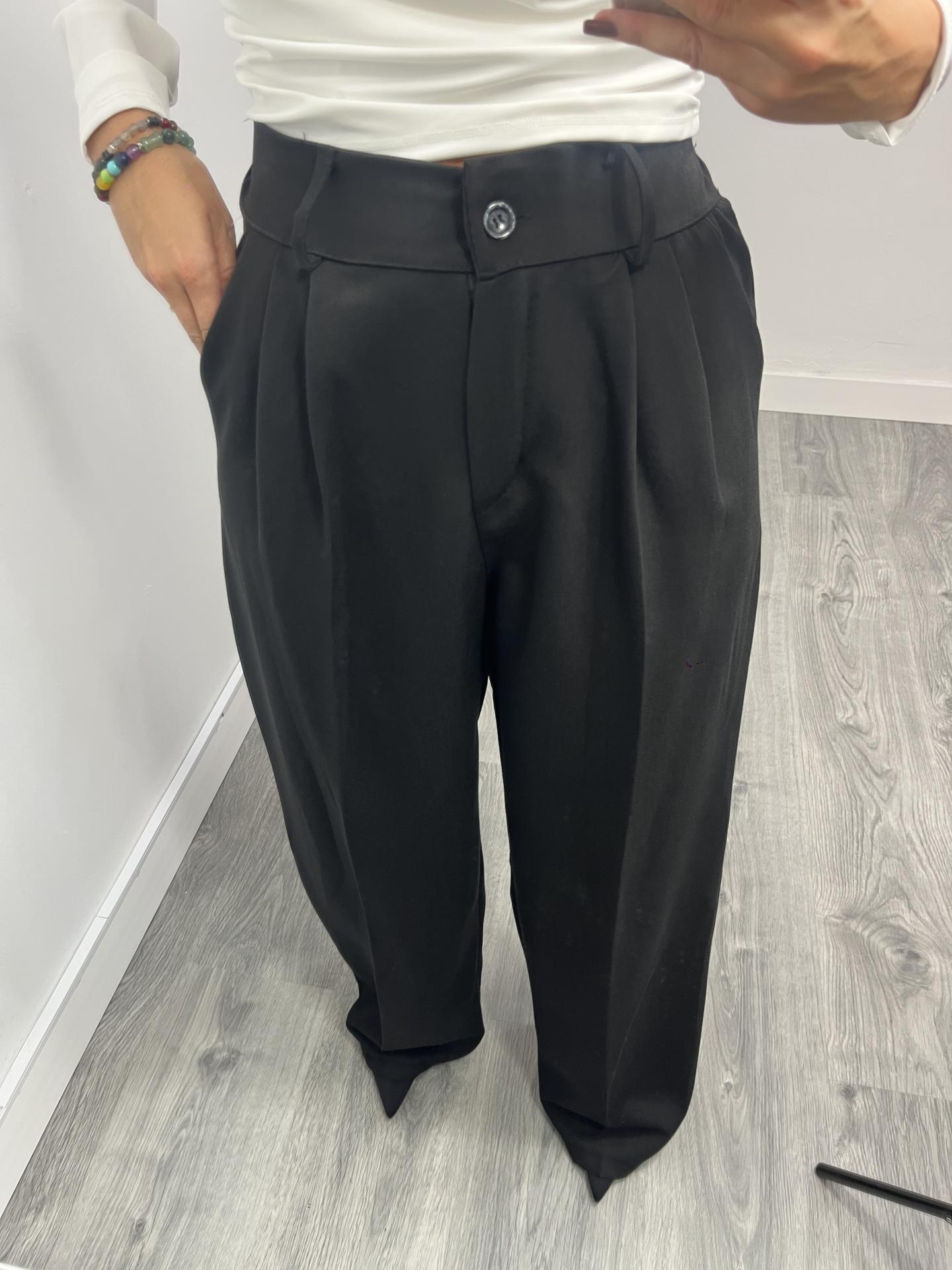 Aporta elegancia y estilo a tu look con este pantalón palazzo negro. Su corte amplio y tiro alto estilizan la figura, mientras las pinzas delanteras aportan un toque sofisticado. Ideal para combinar con blusas, tops o camisas, perfecto para oficina, eventos o looks de noche.