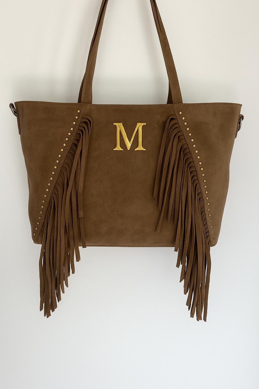 Bolso de ante con flecos y letra bordada dorada Personalizado