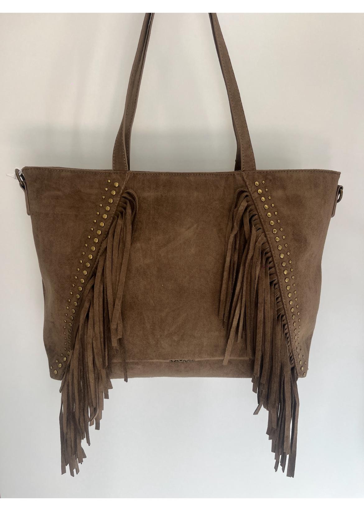 Descubre nuestro bolso de ante marrón con flecos y detalles dorados, una pieza única que combina elegancia y espíritu libre. Fabricado en suave ante de alta calidad, este bolso destaca por su diseño artesanal con tachuelas doradas y flecos laterales, que aportan movimiento y personalidad.