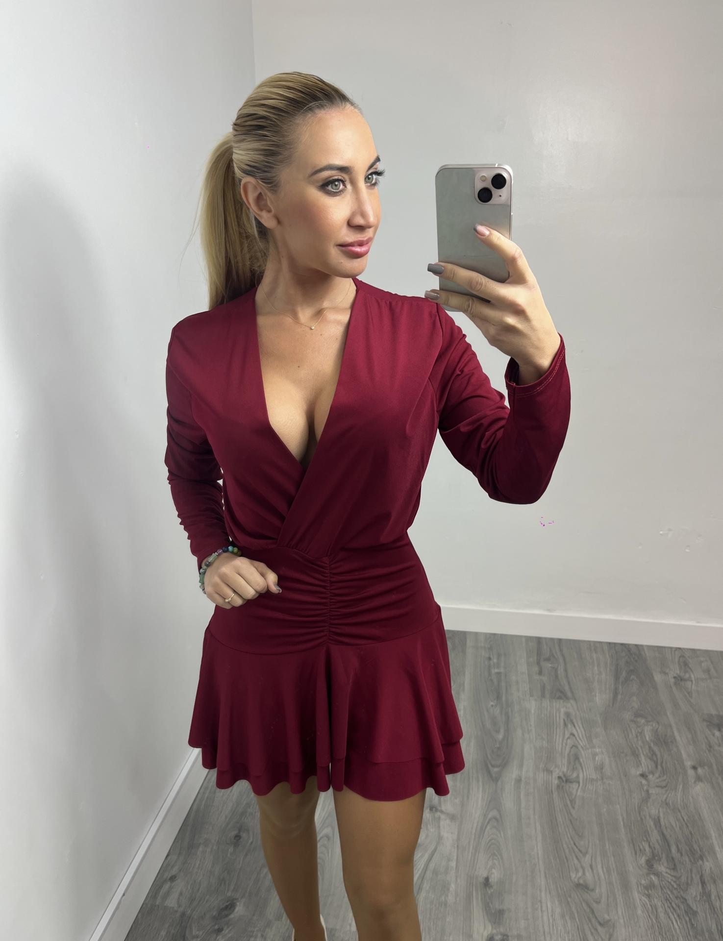 Este mono destaca por su escote cruzado profundo, su cintura fruncida moldeadora y su faldita con doble capa, que aporta movimiento y un toque femenino. Es ideal como mono para fiestas, mono para cenas, eventos especiales o para crear un look sofisticado y moderno en tu día a día.