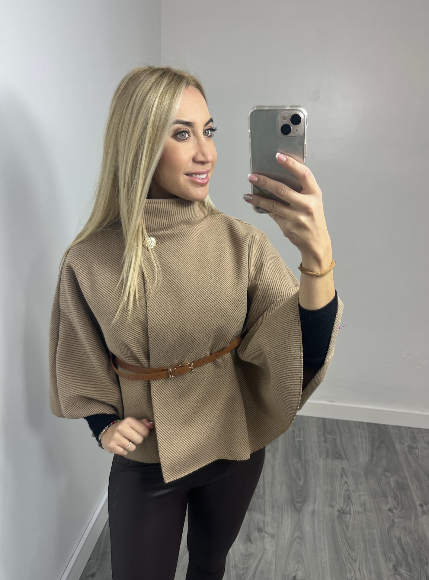 nuestra capa con cinturón, una pieza versátil, sofisticada y de tendencia que elevará cualquier look. Su diseño fluido con efecto cape estilo poncho, aporta movimiento y elegancia, mientras que el cinturón ajustable define la figura y estiliza la silueta.