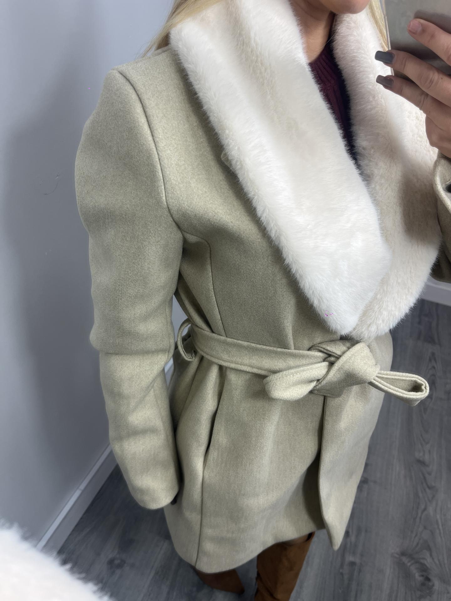 Descubre el abrigo beige elegante con cuello de pelito desmontable, una prenda versátil y súper chic ideal para los días fríos. Su diseño con cinturón realza la figura y aporta un toque sofisticado a cualquier look, combinando perfectamente con botas, vestidos o jeans.