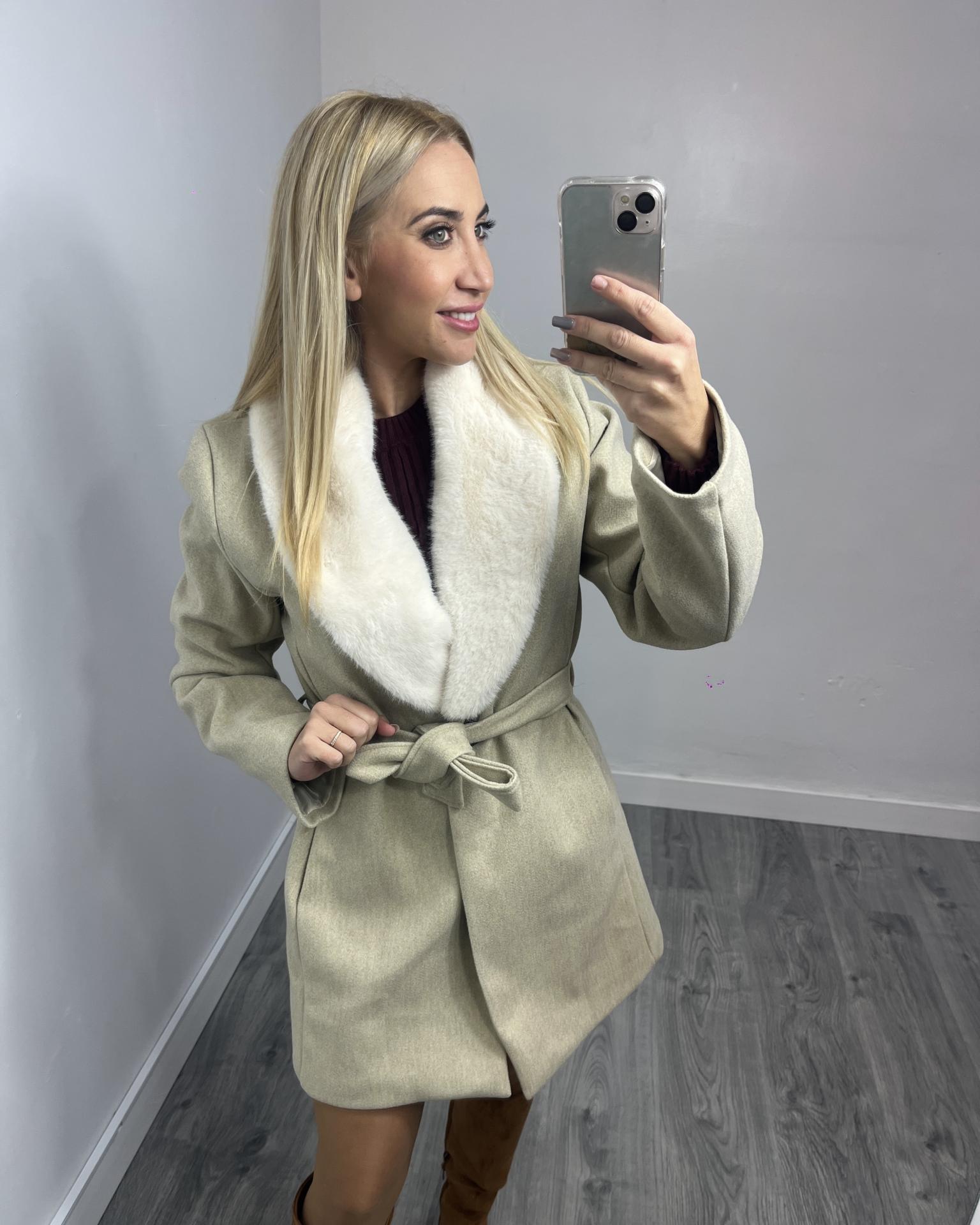 Abrigo Beige Elegante con Cuello de Pelito Desmontable