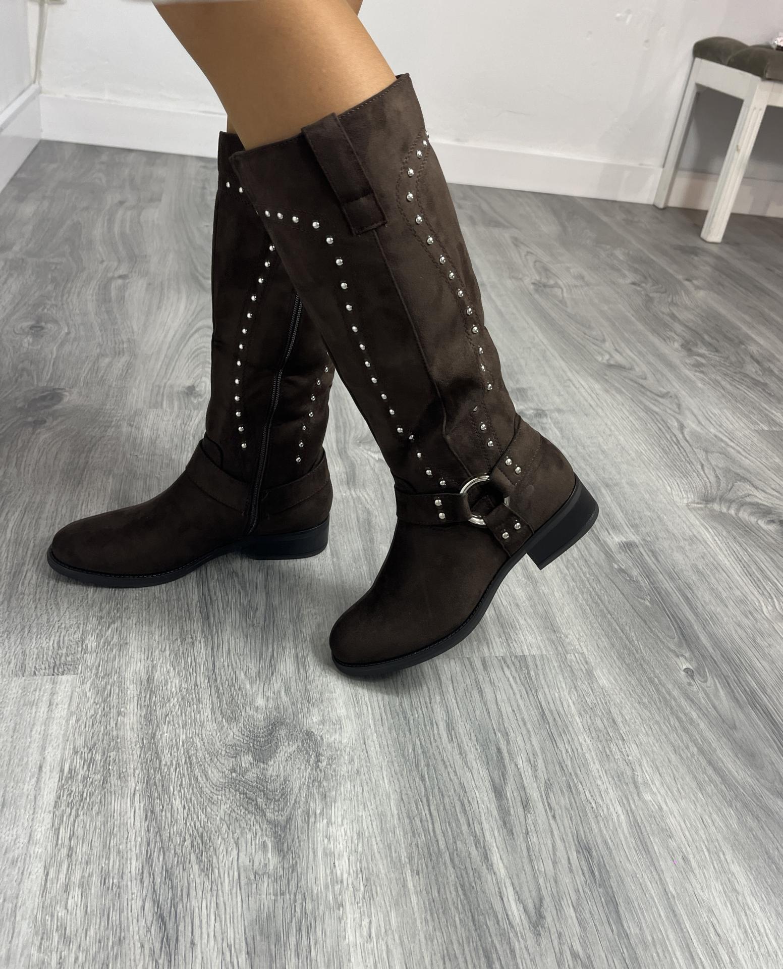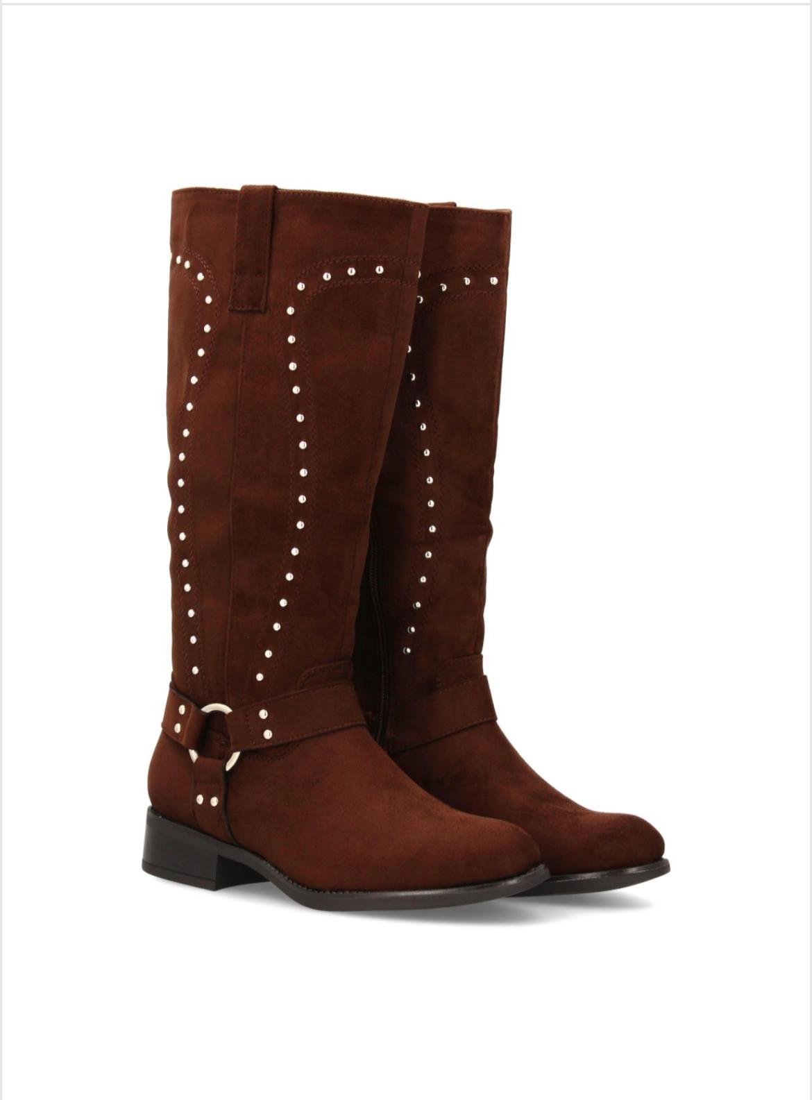 Estas botas camperas de mujer en color marrón están fabricadas en suave acabado tipo ante y decoradas con tachuelas metálicas que realzan su diseño estilizado y moderno. Su caña alta, horma cómoda y suela resistente las convierten en el calzado perfecto para el día a día, combinando estilo, calidad y confort.