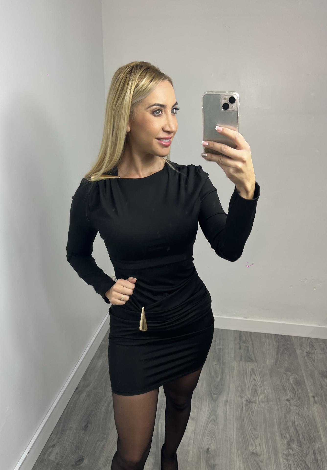 Cuenta con manga larga, ideal para entretiempo y noches especiales, y un detalle fruncido lateral con colgante decorativo, que estiliza la figura y aporta un toque sofisticado y actual.