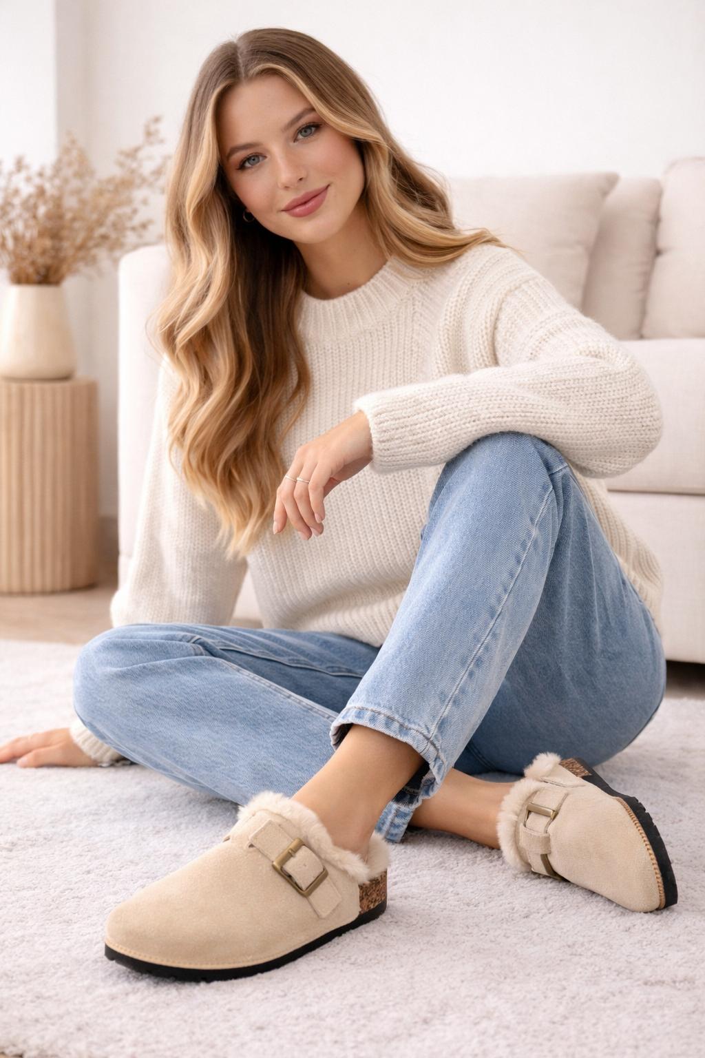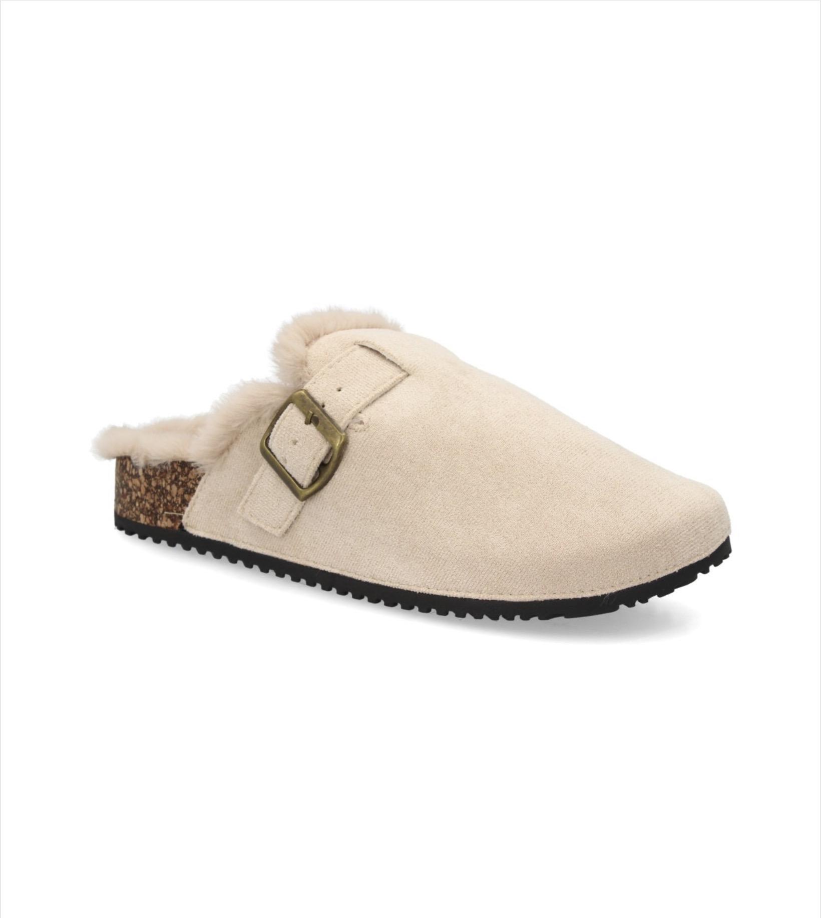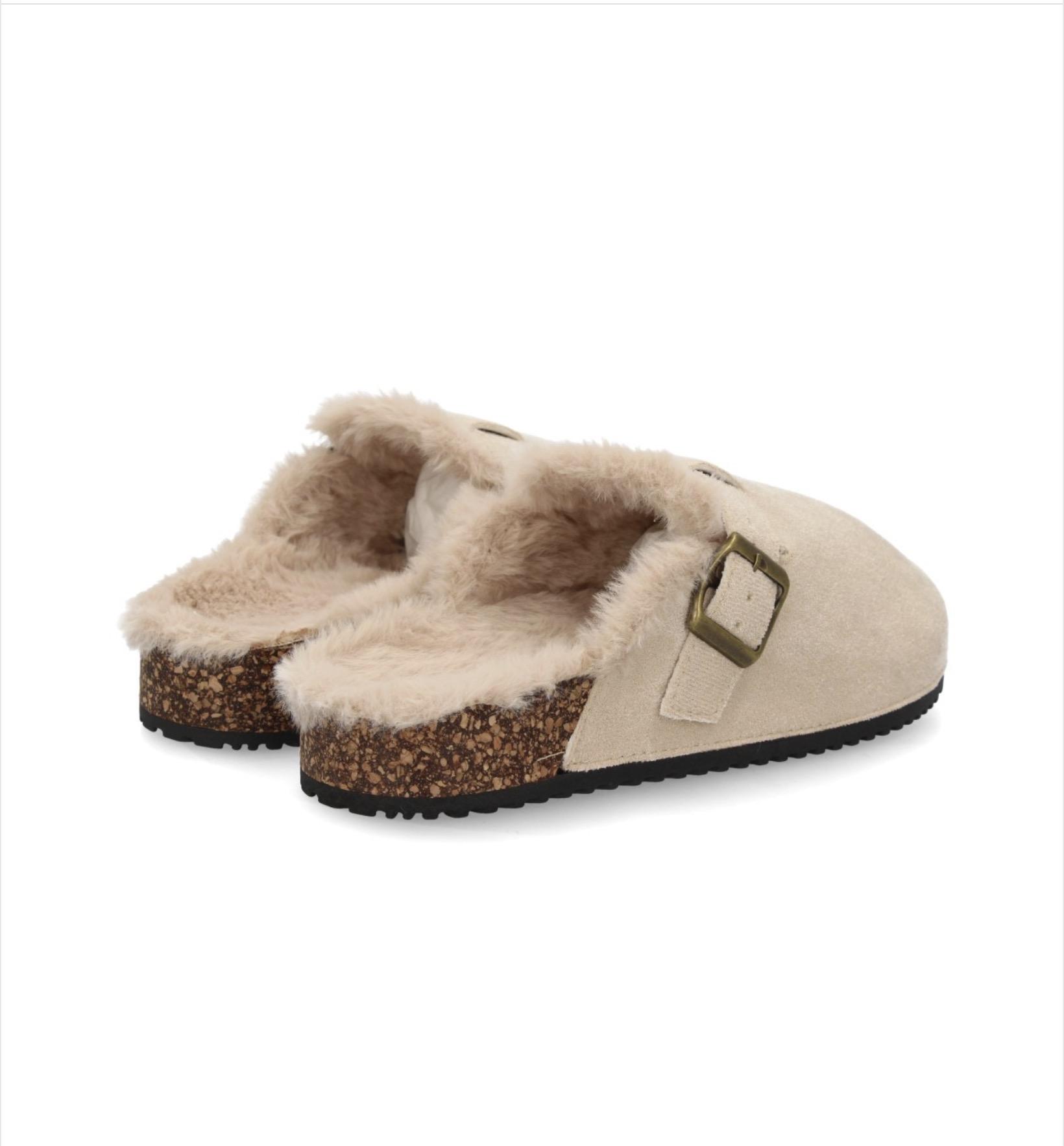 Zueco tipo sabot para mujer con punta cerrad, interior forrado de borreguito sintético suave que aporta calidez. Plantilla tipo bio. Ideal para otoño invierno.