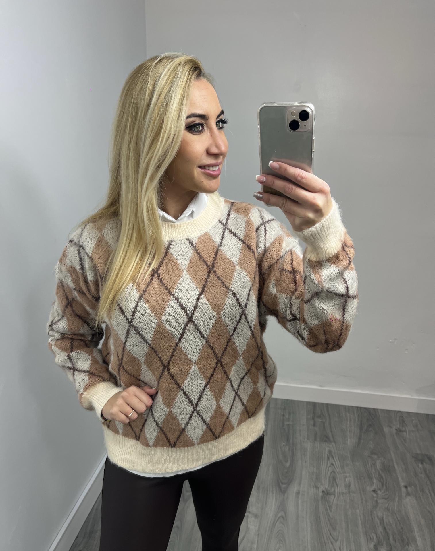 Diseñado con un delicado estampado de rombos en tonos beige, marrón y crudo, aporta calidez y estilo sin esfuerzo. Su tejido es suave, gustoso y muy cómodo, perfecto para el día a día durante los meses de otoño e invierno.