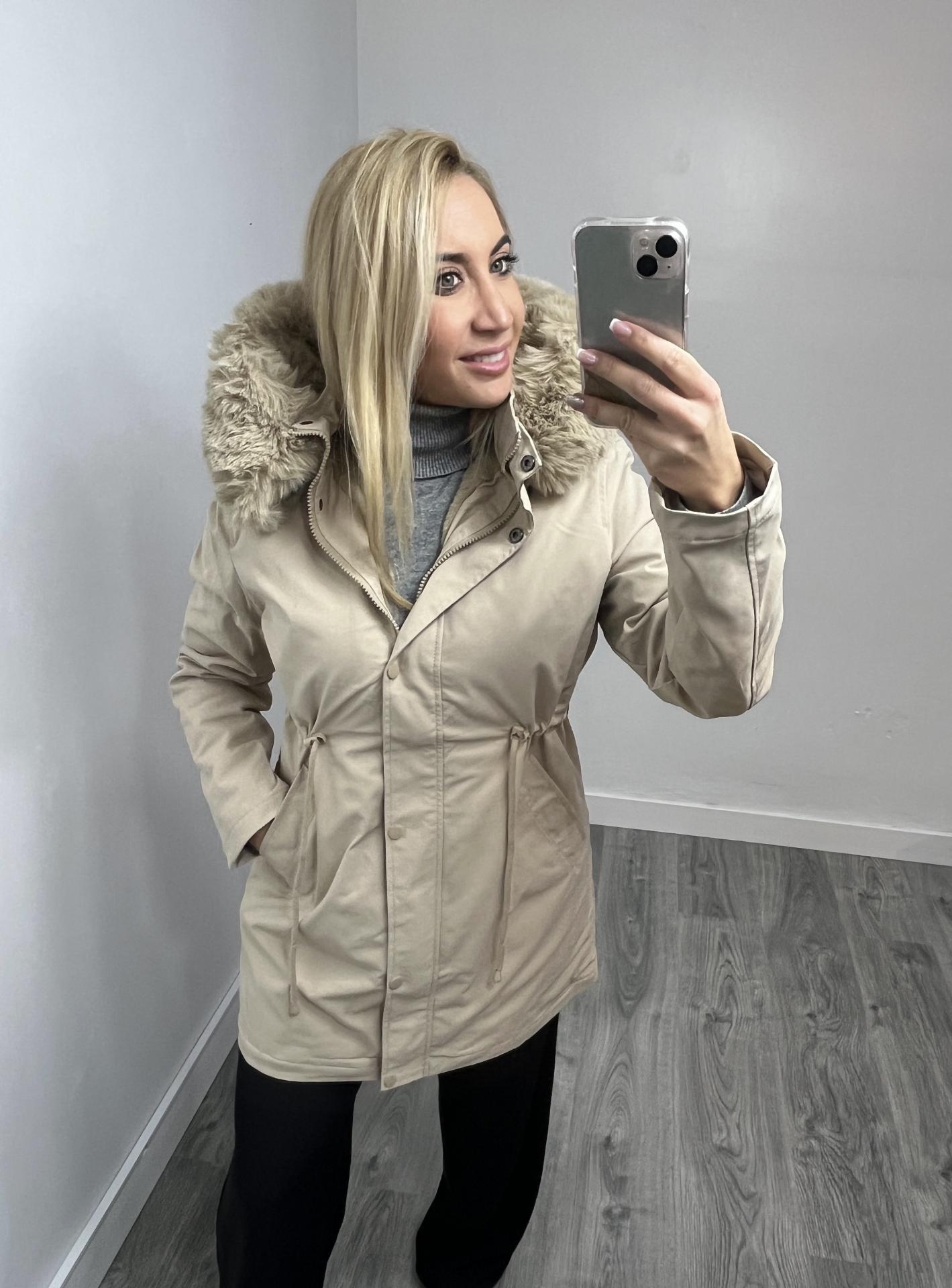Abrigo Mujer Beige con Capucha y Forro Interior de Pelo