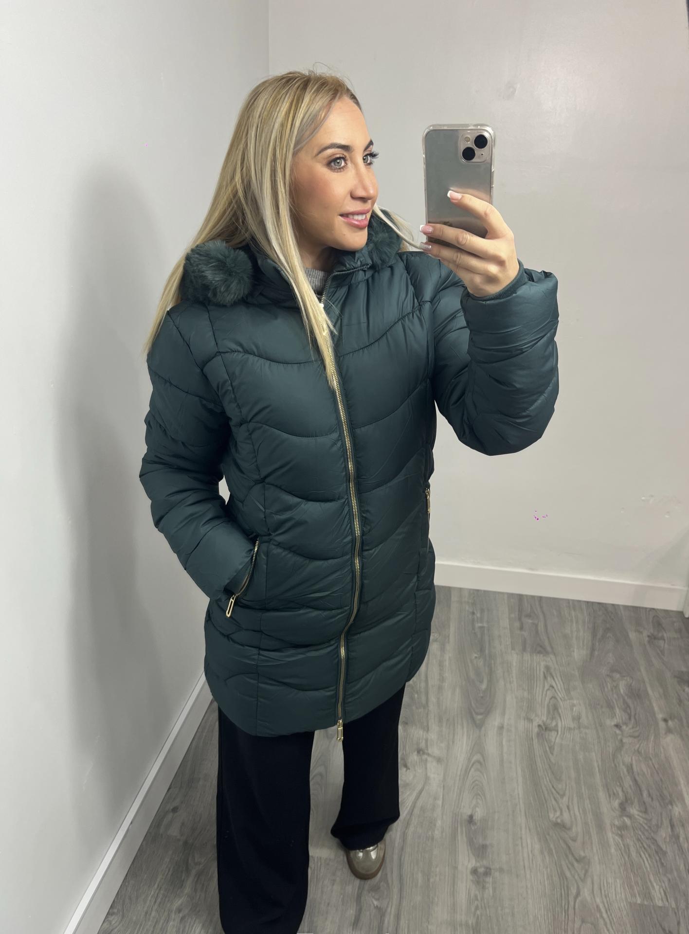 Este abrigo acolchado verde para mujer es la prenda perfecta para los días fríos de otoño e invierno. Diseñado para aportar calidez, estilo y comodidad, cuenta con un forro interior suave tipo peluche que mantiene el calor sin añadir volumen extra.