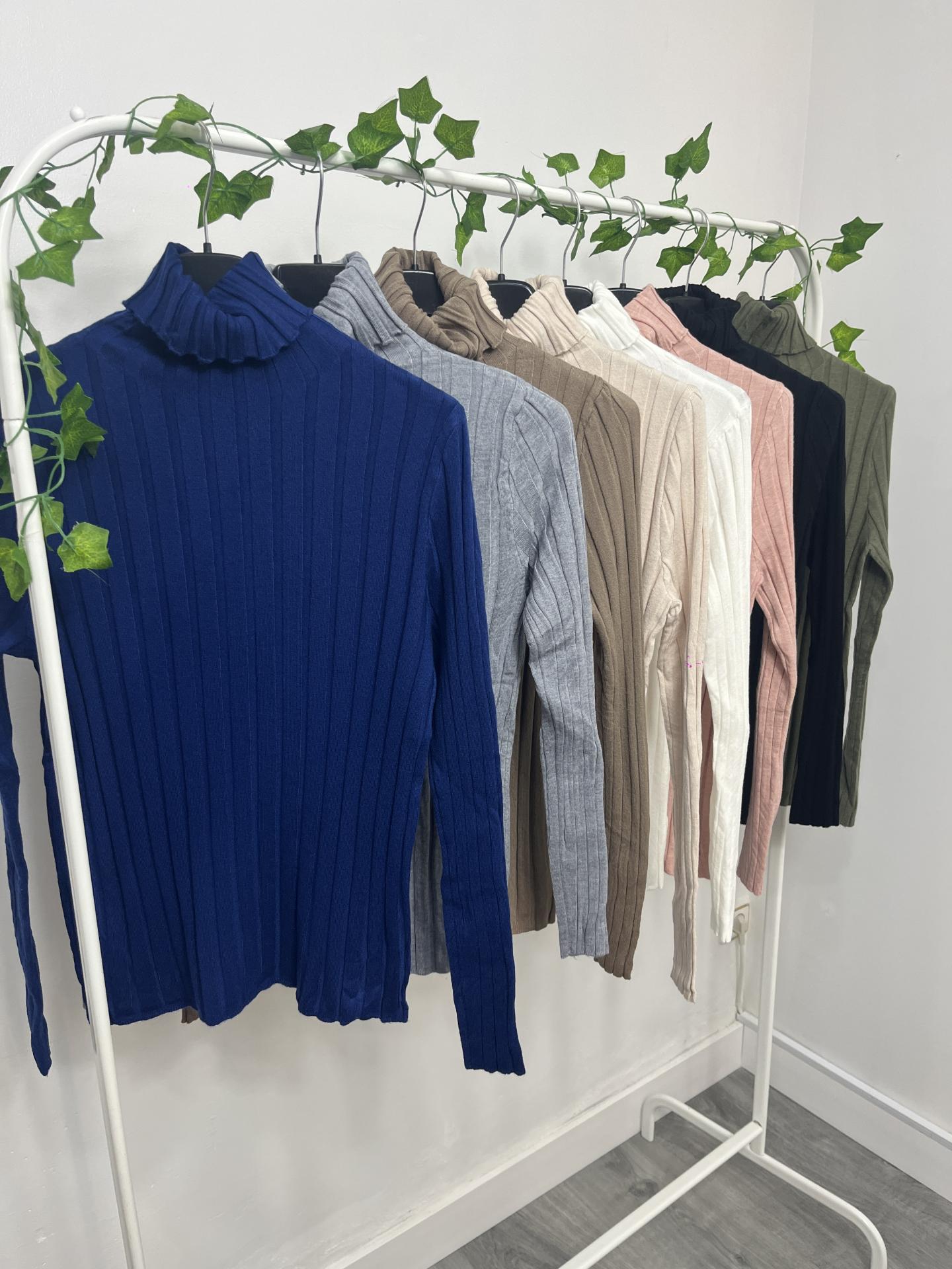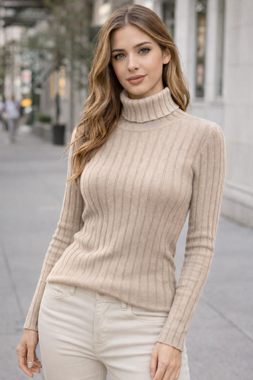 Jersey Beige Elegante Punto Canalé con Cuello Alto