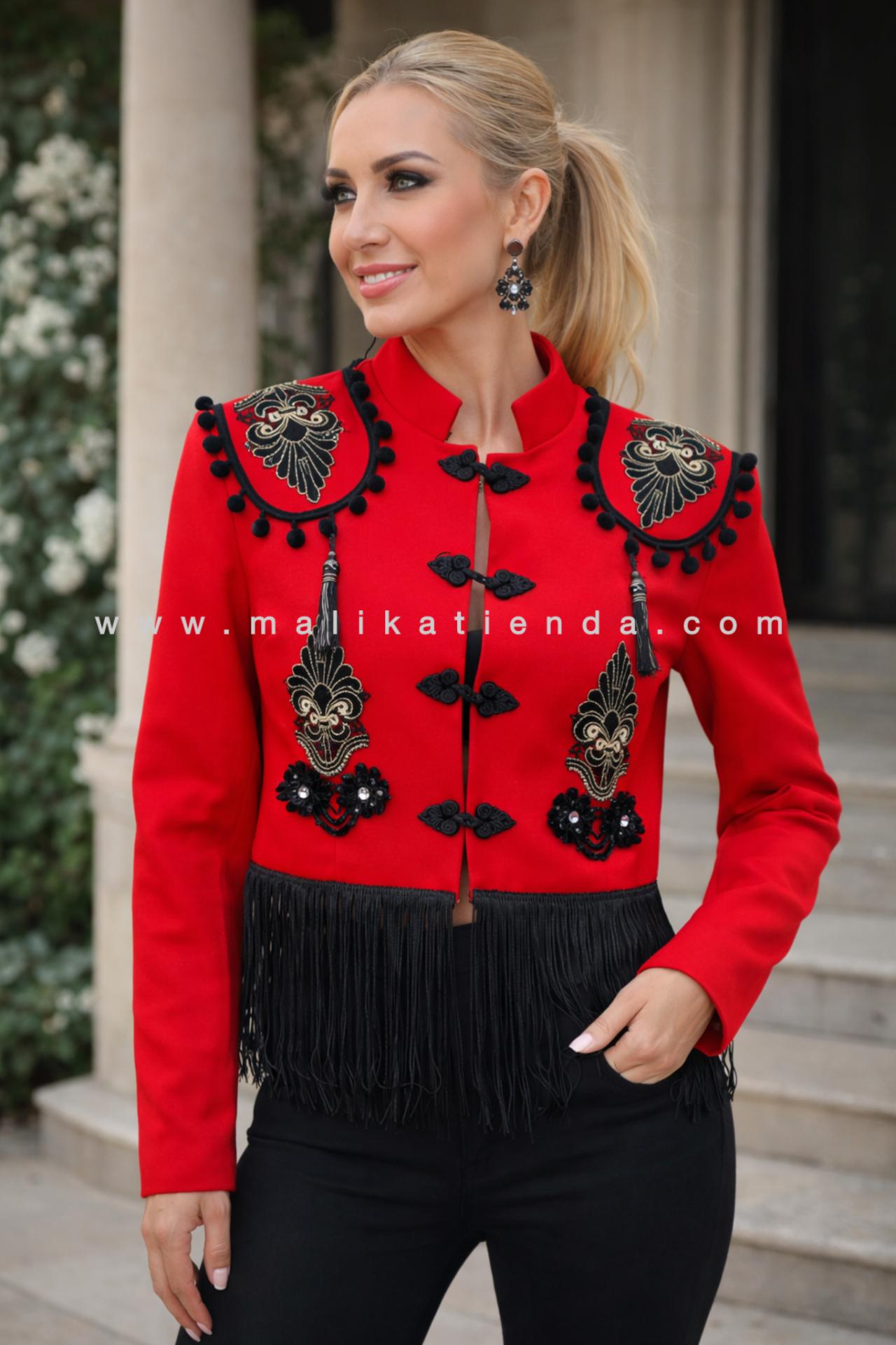 Destaca por sus bordados dorados en los hombros, inspirados en un estilo clásico y refinado, junto con flecos decorativos que aportan movimiento y un toque exclusivo. Es una chaqueta pensada para eventos, ocasiones especiales, cenas o looks de noche, aunque también funciona para elevar un outfit más sencillo.