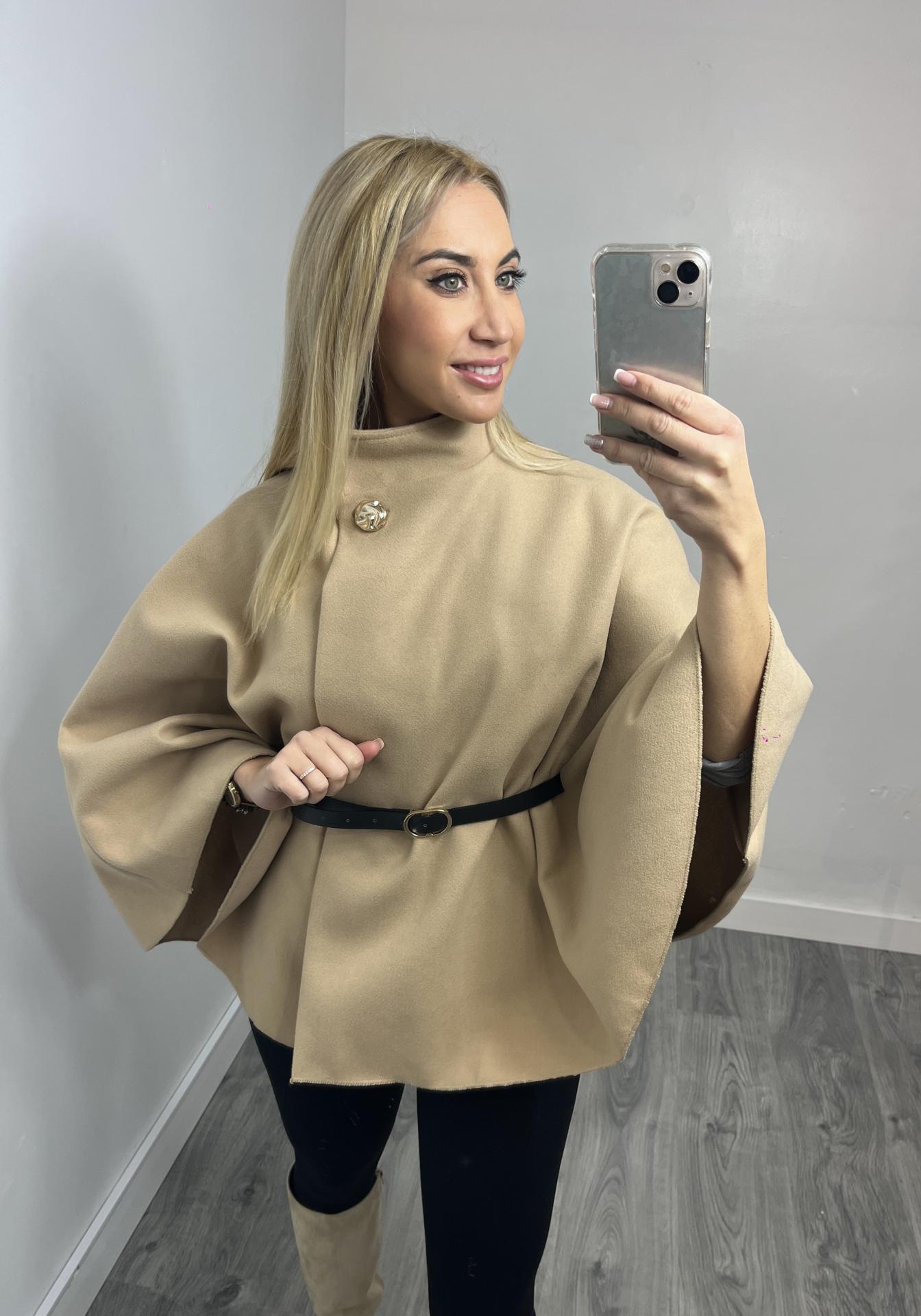 Capa Elegante de Mujer con Cinturón Camel