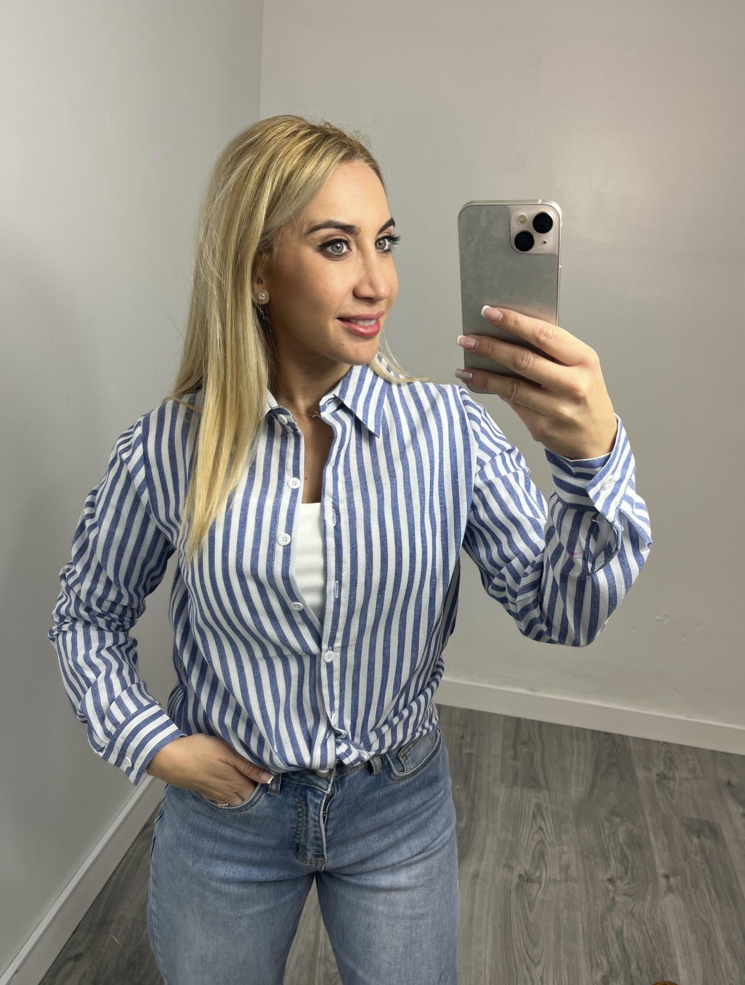 Camisa de rayas para mujer, una prenda atemporal y en tendencia esta temporada, disponible en varios colores. Su diseño clásico con rayas verticales estiliza la figura, mientras que su tejido ligero y cómodo la convierte en una opción ideal para el día a día.