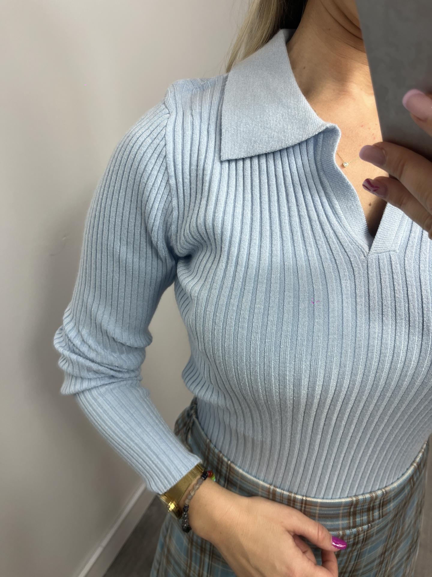 Este jersey polo de punto canalé para mujer es el básico imprescindible que no puede faltar en tu armario. Con un diseño elegante y atemporal, destaca por su cuello tipo polo y su tejido acanalado elástico que se adapta perfectamente al cuerpo.