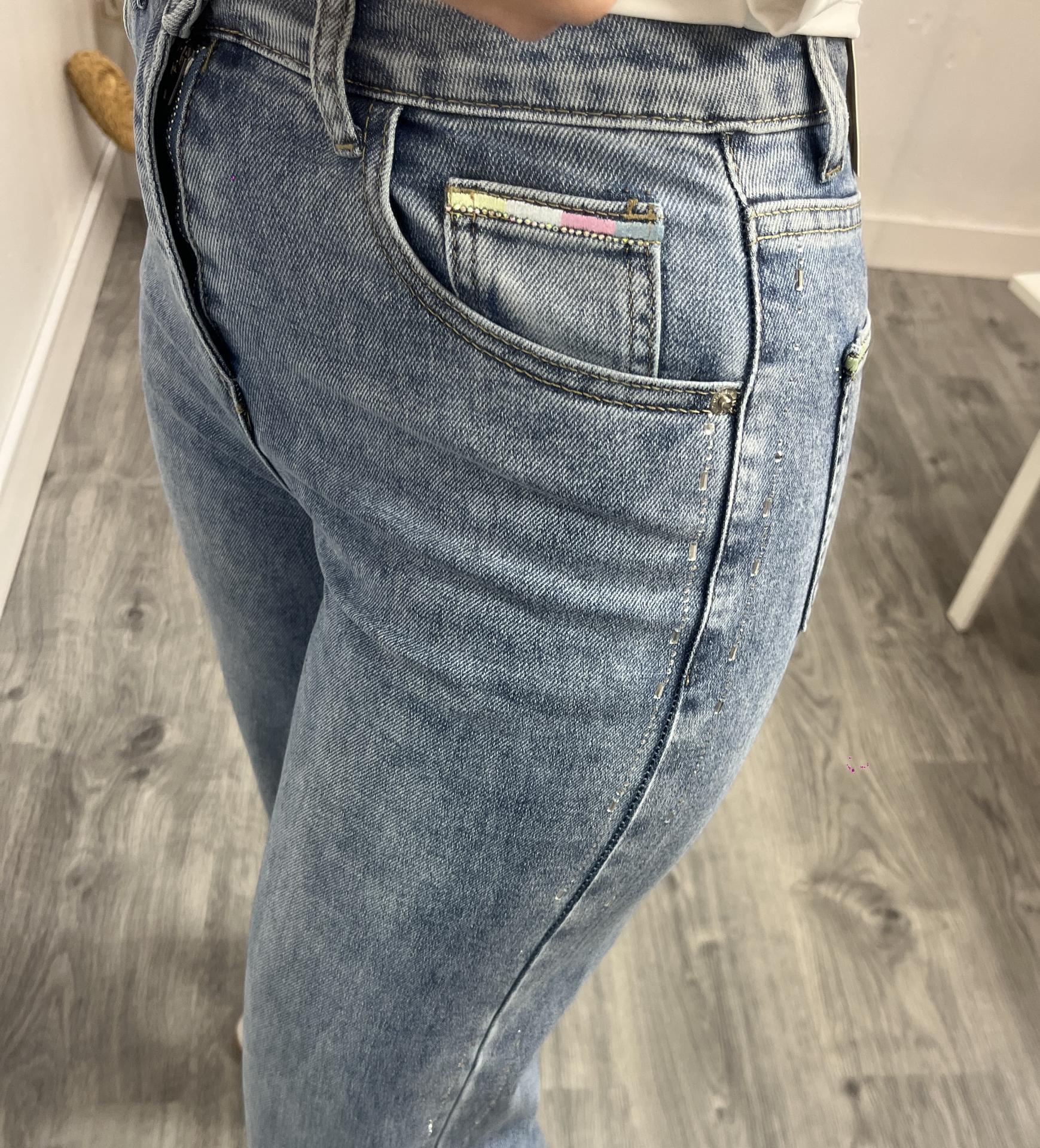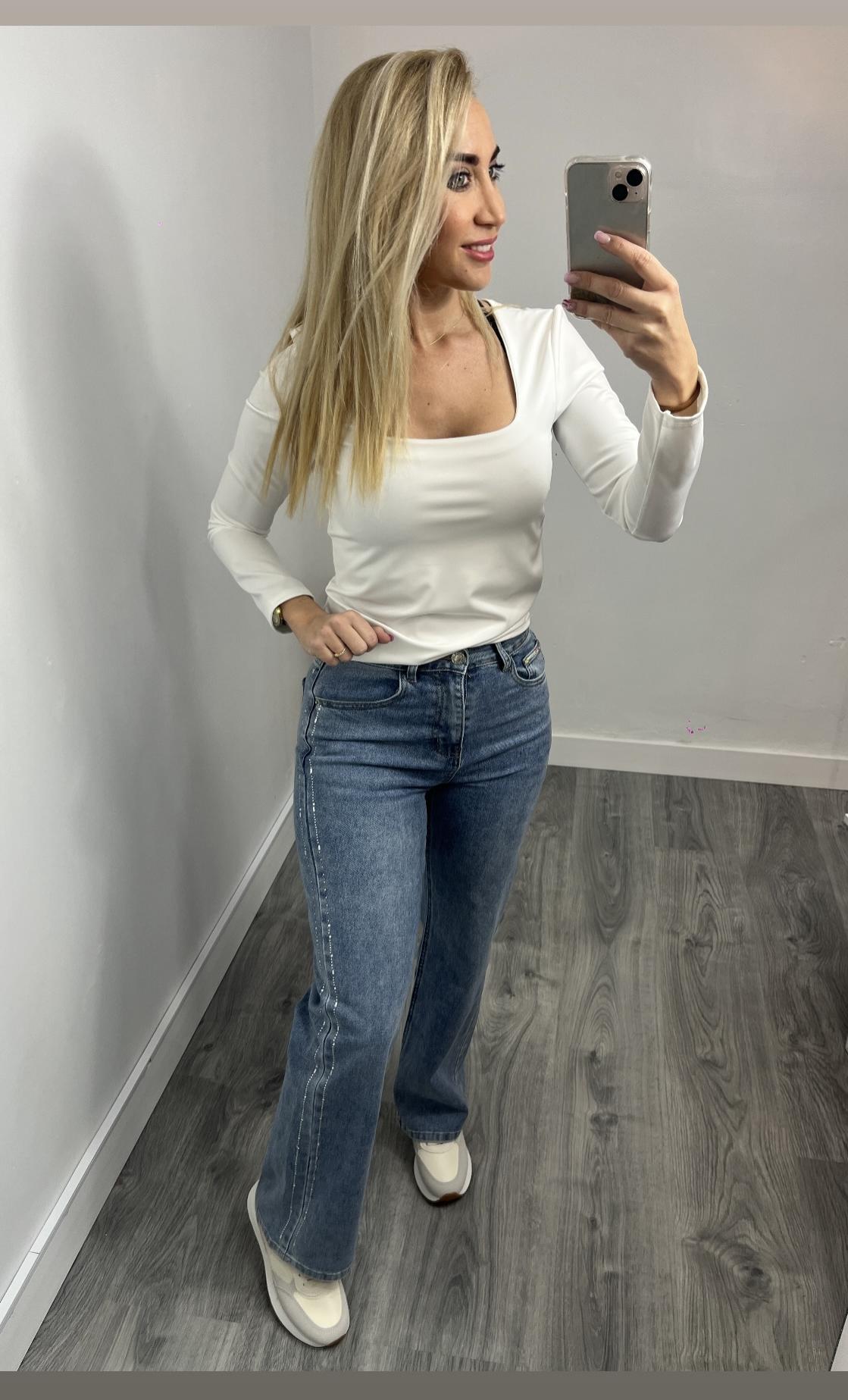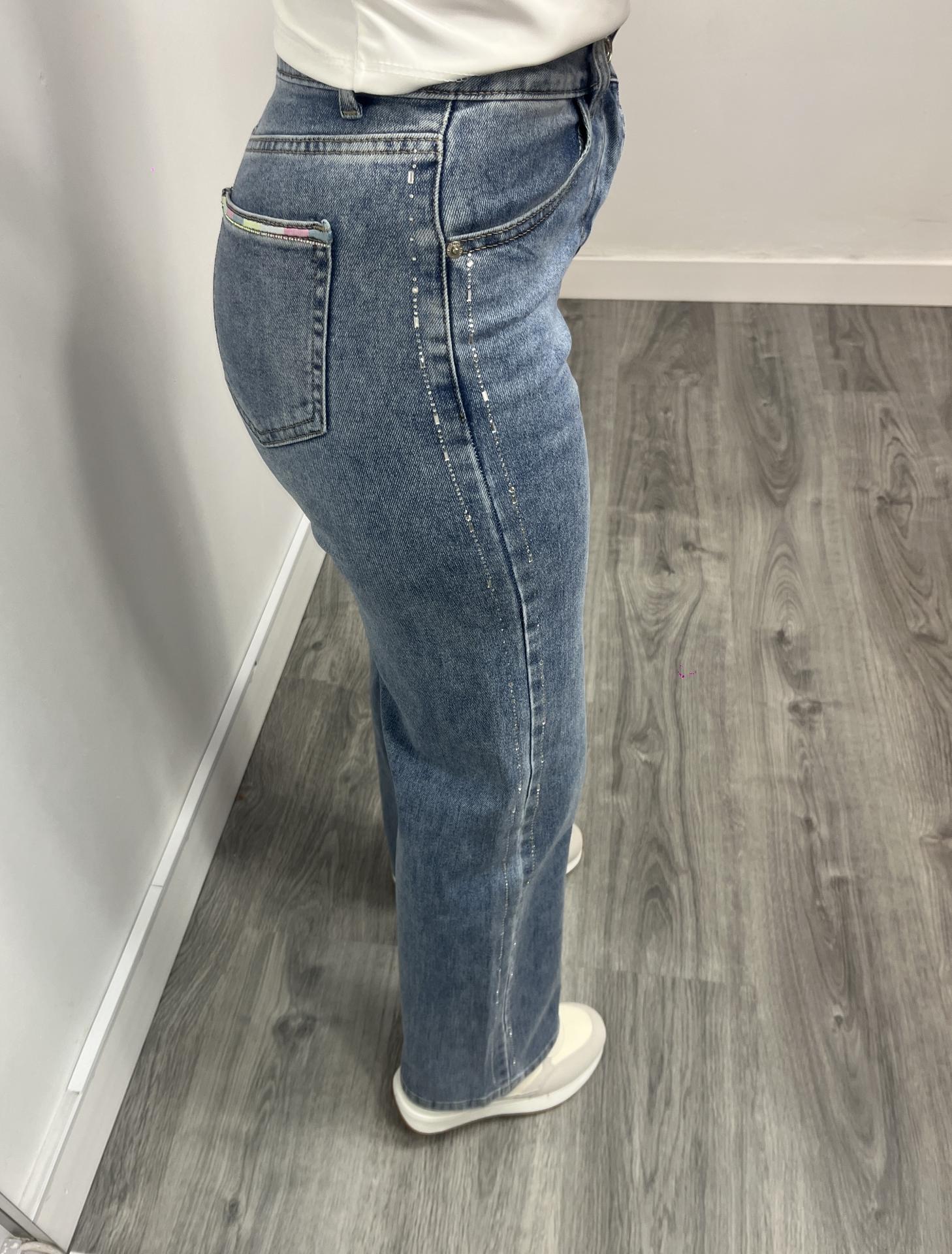 Jeans anchos de tendencia con detalle lateral brillante que aporta un toque especial al look.