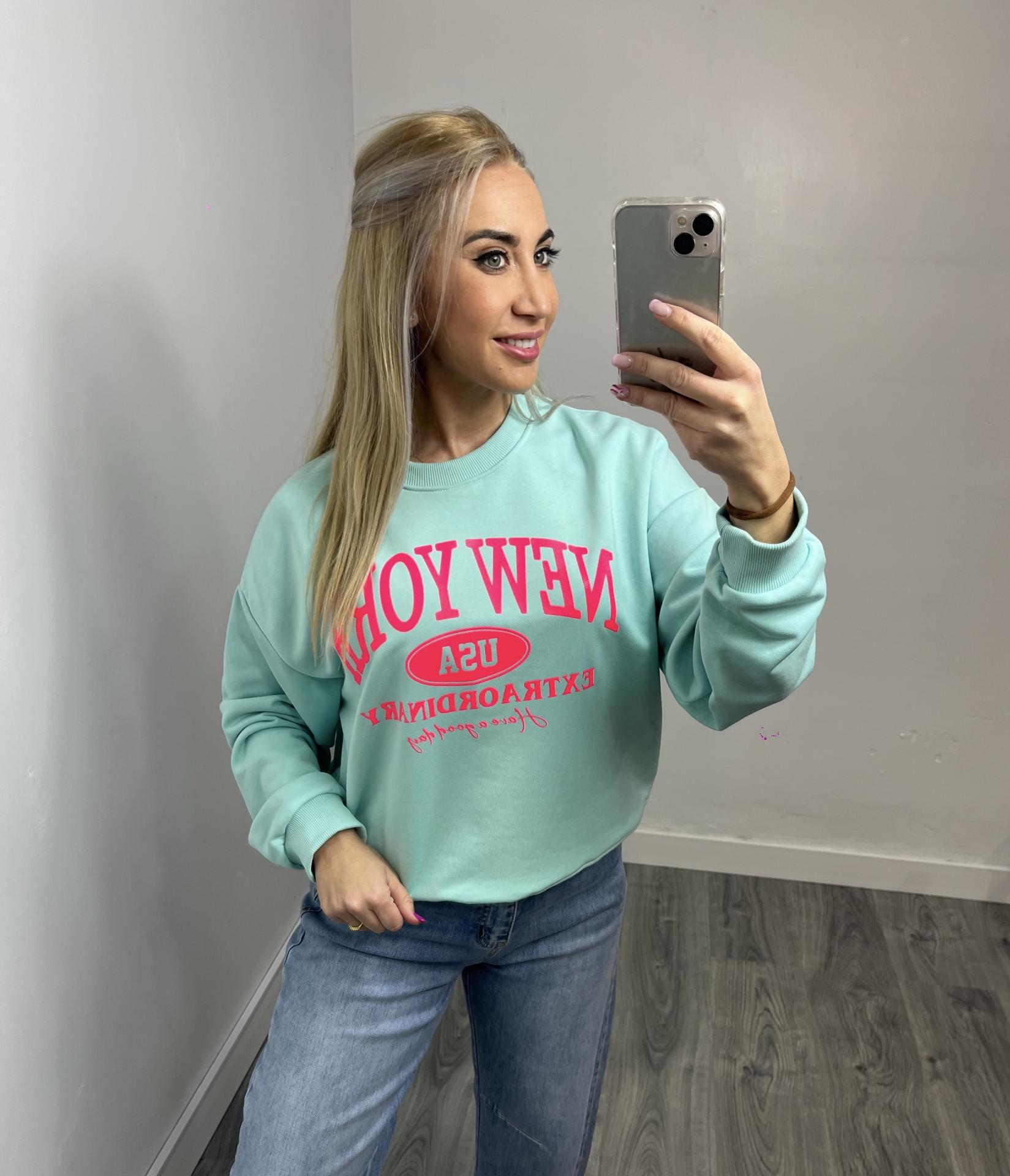 La sudadera oversize verde agua para mujer estilo New York es la prenda perfecta para un look cómodo, actual y con personalidad. Su diseño amplio y relajado la convierte en una opción ideal para el día a día, combinando tendencia y confort en una sola prenda.