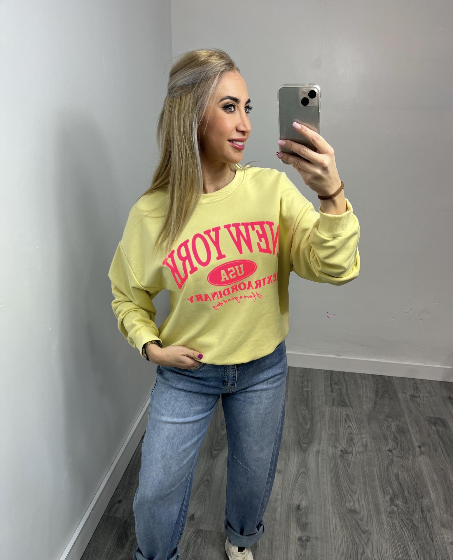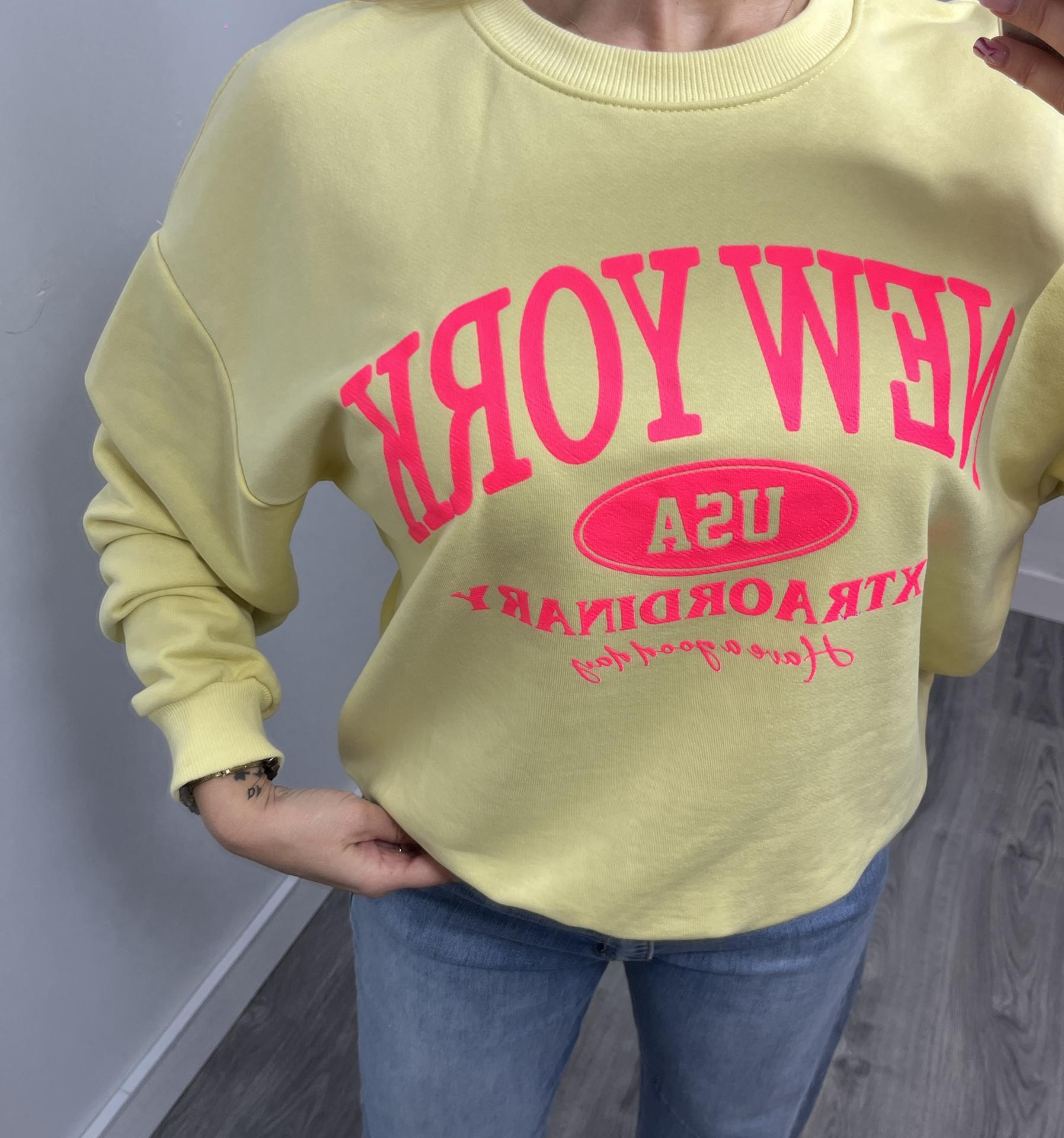 La sudadera oversize amarilla para mujer estilo New York es la prenda perfecta para un look cómodo, actual y con personalidad. Su diseño amplio y relajado la convierte en una opción ideal para el día a día, combinando tendencia y confort en una sola prenda.