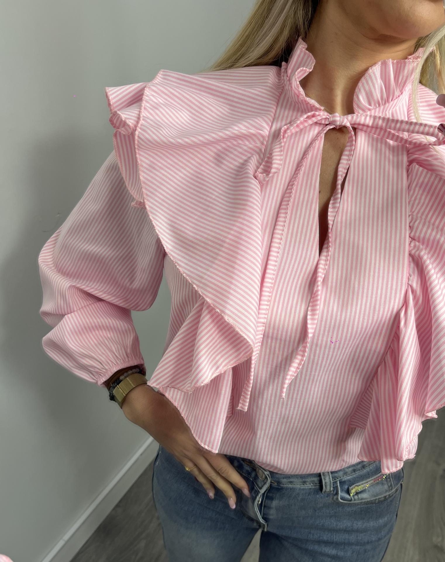 Nuestra blusa rosa de rayas para mujer es la combinación perfecta entre estilo romántico y tendencia actual. Su diseño con volantes frontales y en hombros, junto con el detalle de lazo en el cuello, aporta un toque femenino y sofisticado ideal para looks arreglados o casual chic.