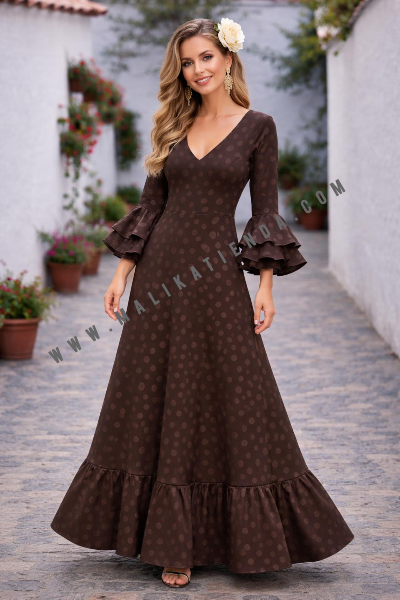 Bata Rociera de Lunares con Escote en V y Tejido Elástico Marrón