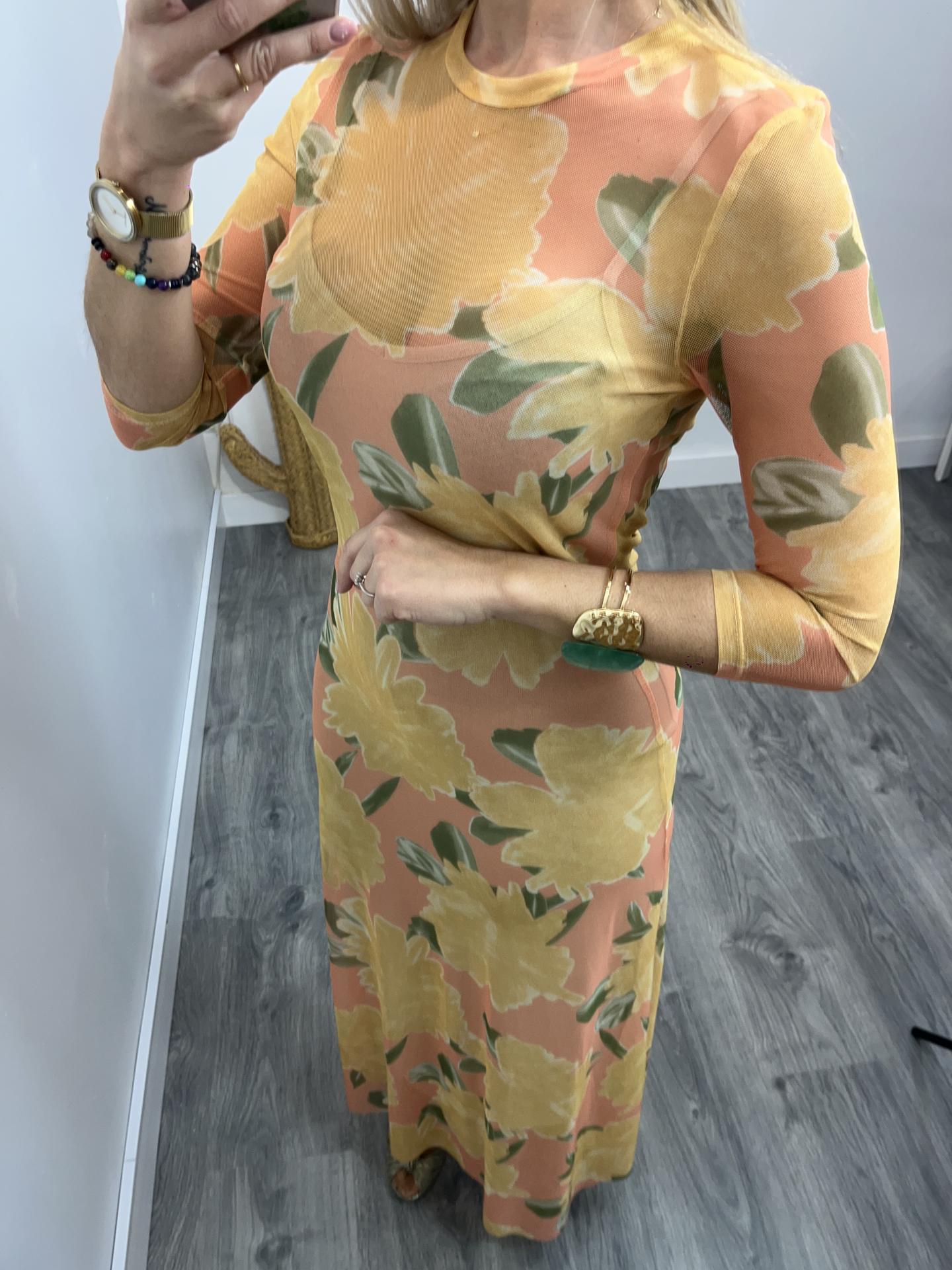 Diseñado con un tejido ligero y adaptable, este vestido se ajusta perfectamente al cuerpo, realzando la silueta sin marcar. Su estampado floral aporta un toque femenino y sofisticado, perfecto para destacar en cualquier ocasión.