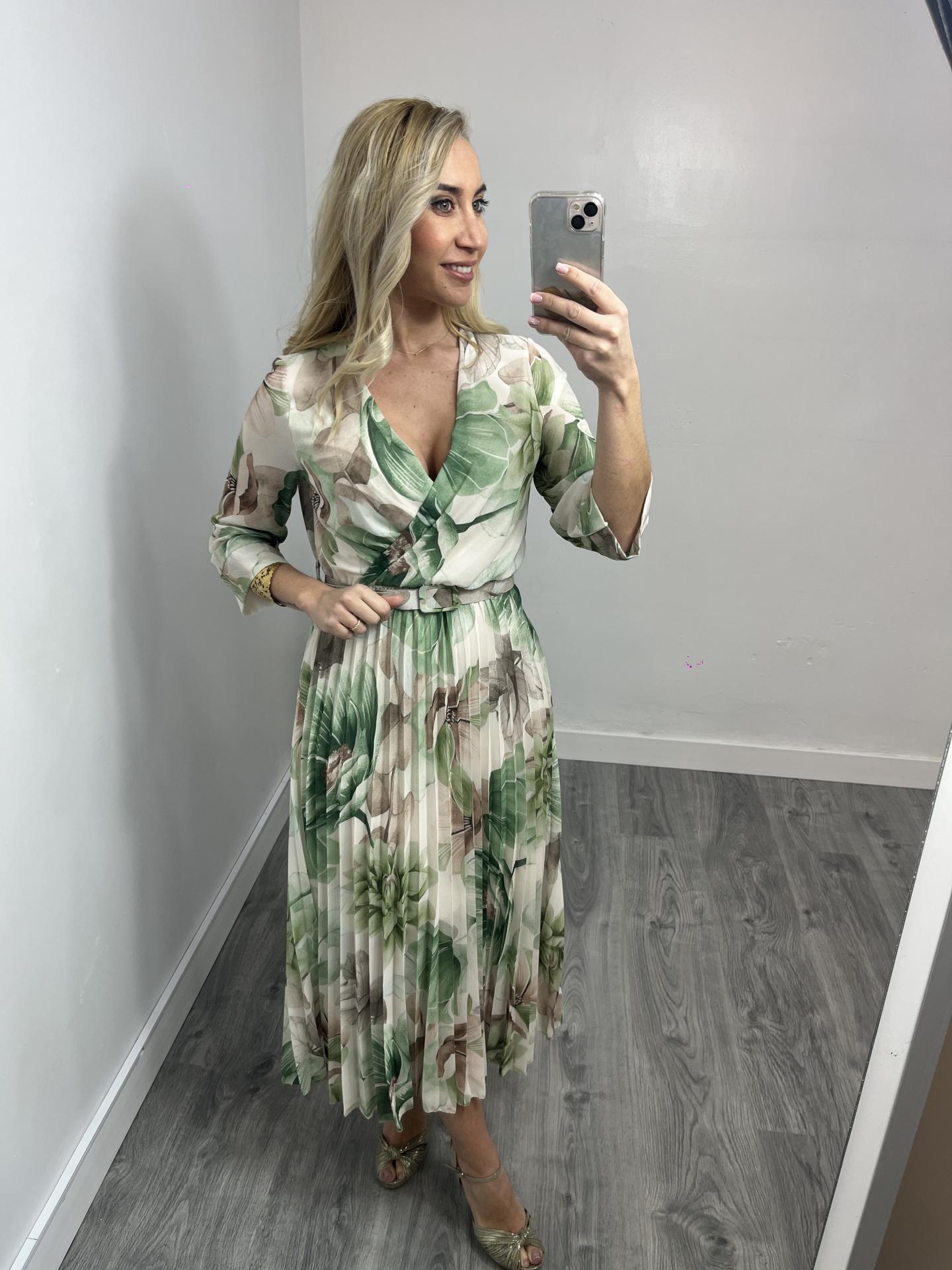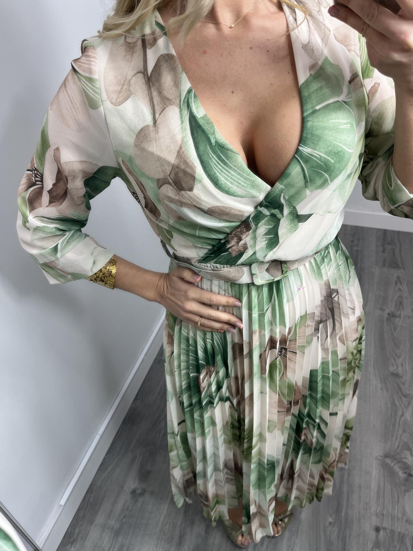 El vestido cuenta con falda plisada con movimiento, cinturón que marca la cintura y escote cruzado tipo wrap, creando una silueta estilizada que se adapta cómodamente al cuerpo.