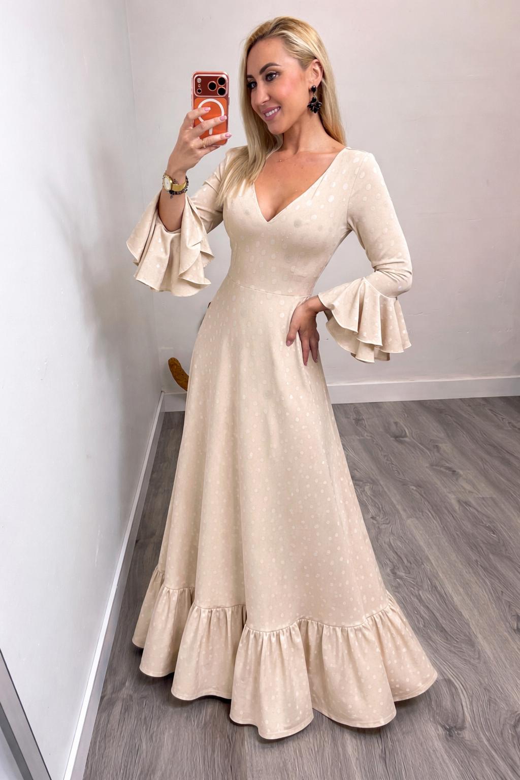 Bata Rociera de Lunares con Escote en V y Tejido Elástico Beige