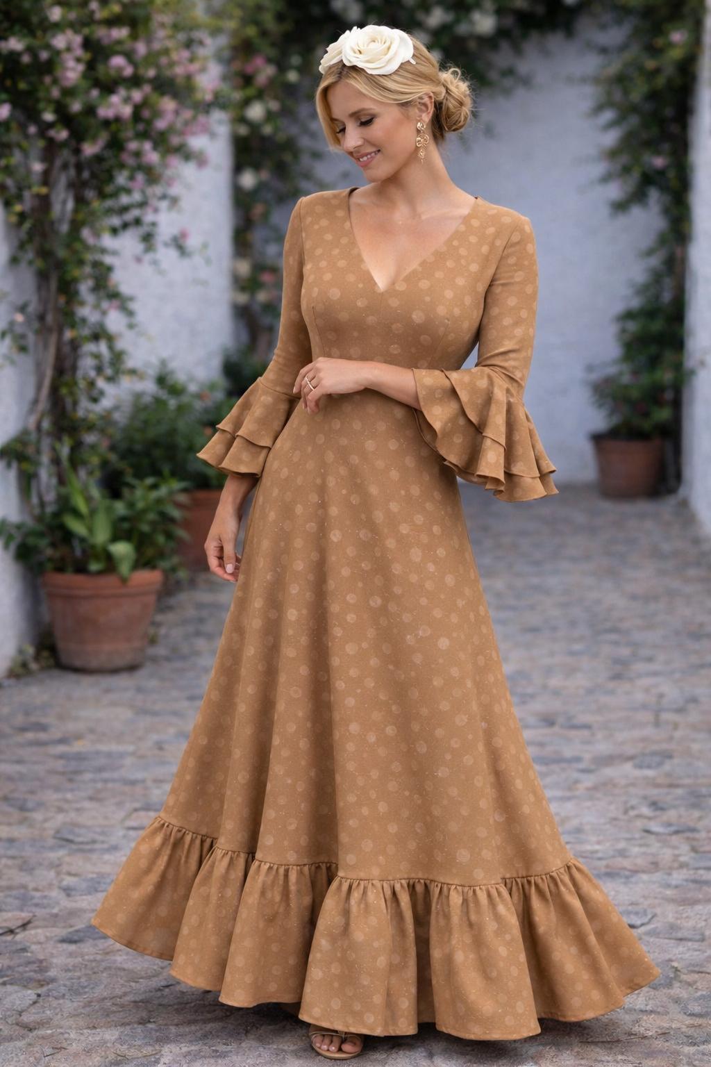 Bata Rociera de Lunares con Escote en V y Tejido Elástico Camel