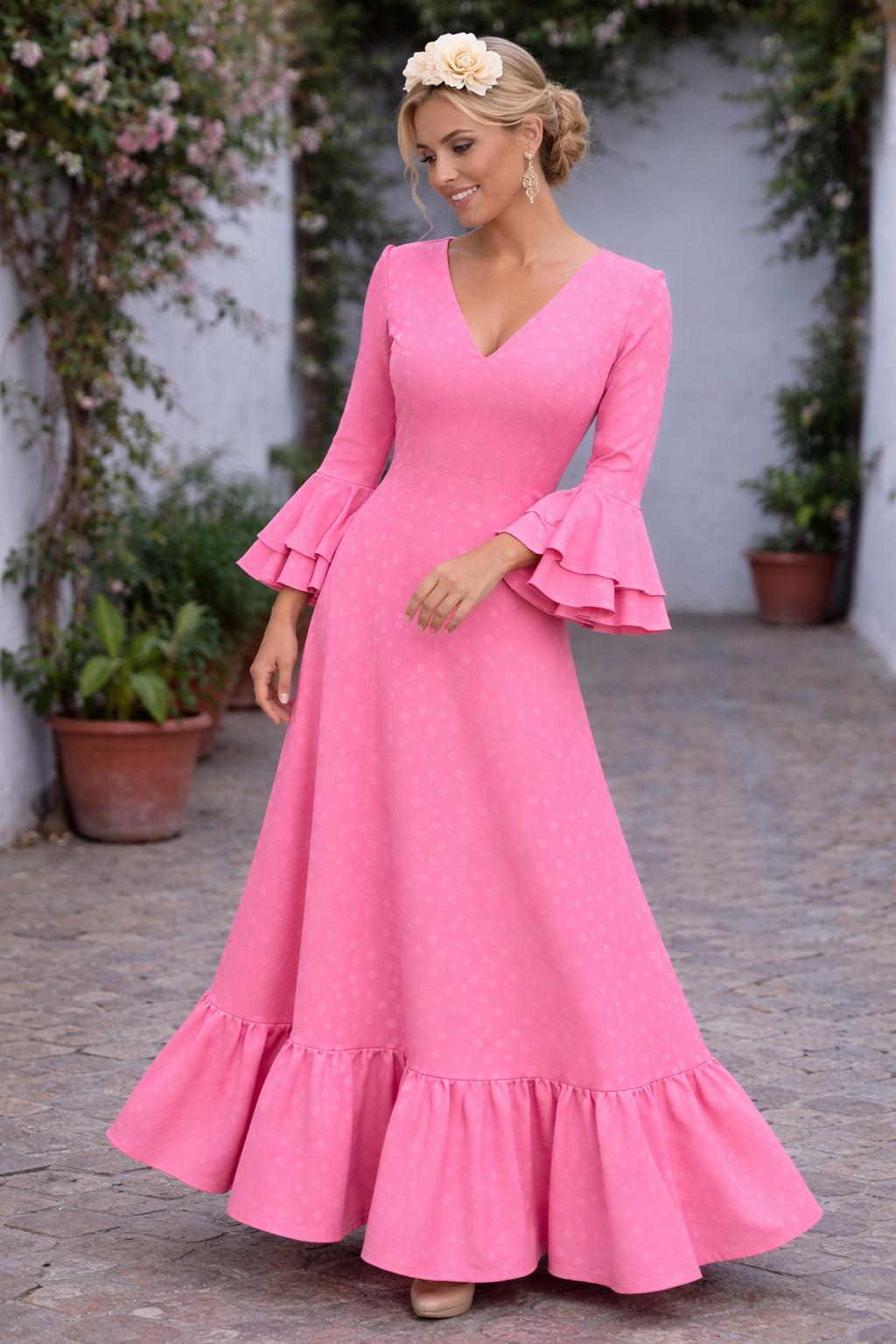 Bata Rociera de Lunares con Escote en V y Tejido Elástico Rosa