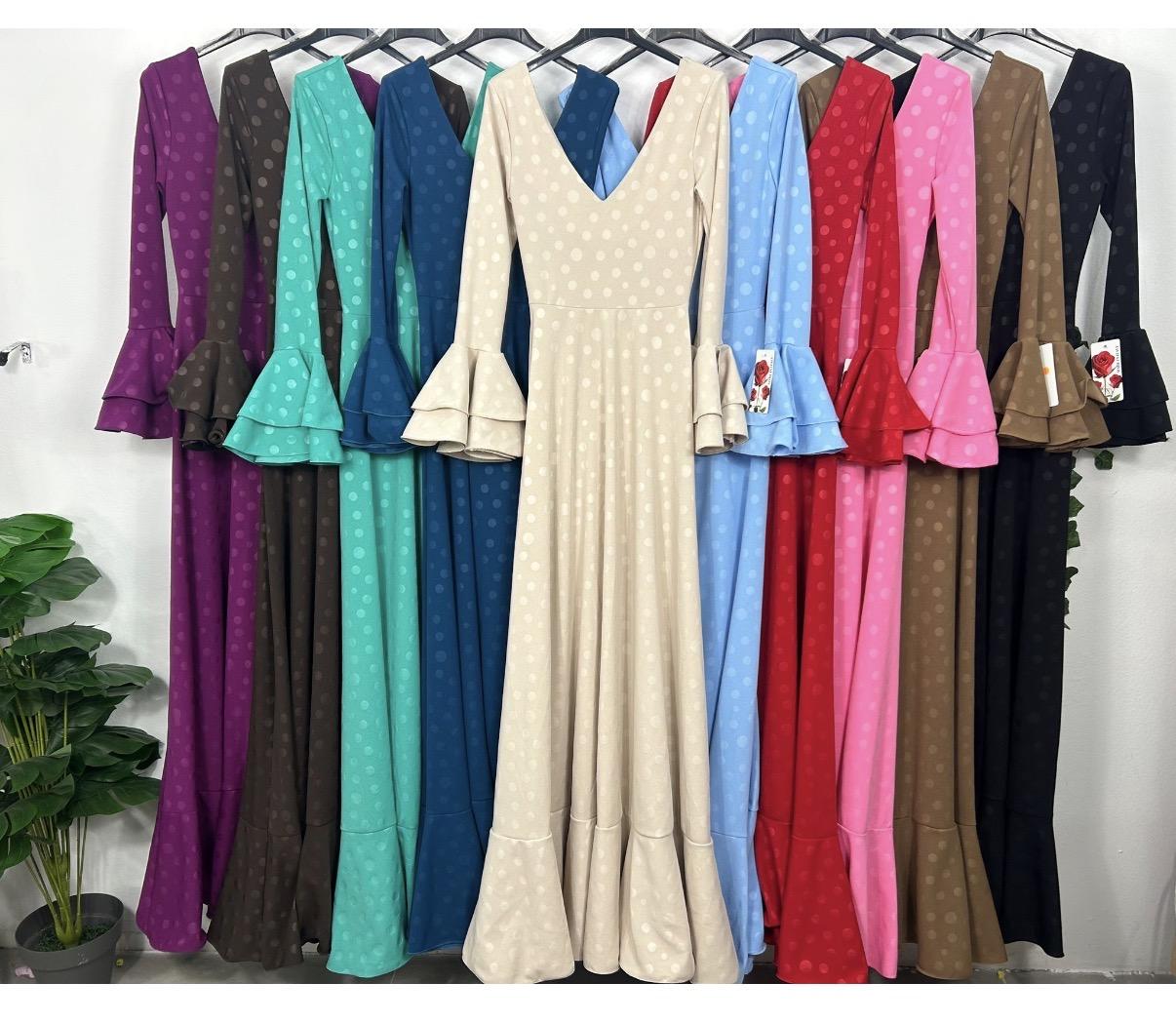 Esta bata rociera de lunares es la elección perfecta para lucir elegante y cómoda en ferias, romerías y eventos flamencos. Con un diseño clásico y favorecedor, presenta escote en V, manga larga con volantes y una caída fluida que estiliza la figura.