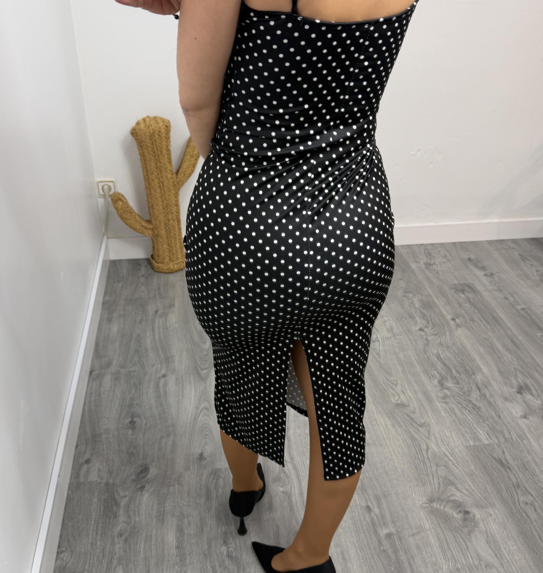 Vestido midi ajustado de lunares para mujer. Diseño elegante con tirantes y tejido elástico. Talla única (34-38). Ideal para eventos y looks de noche.