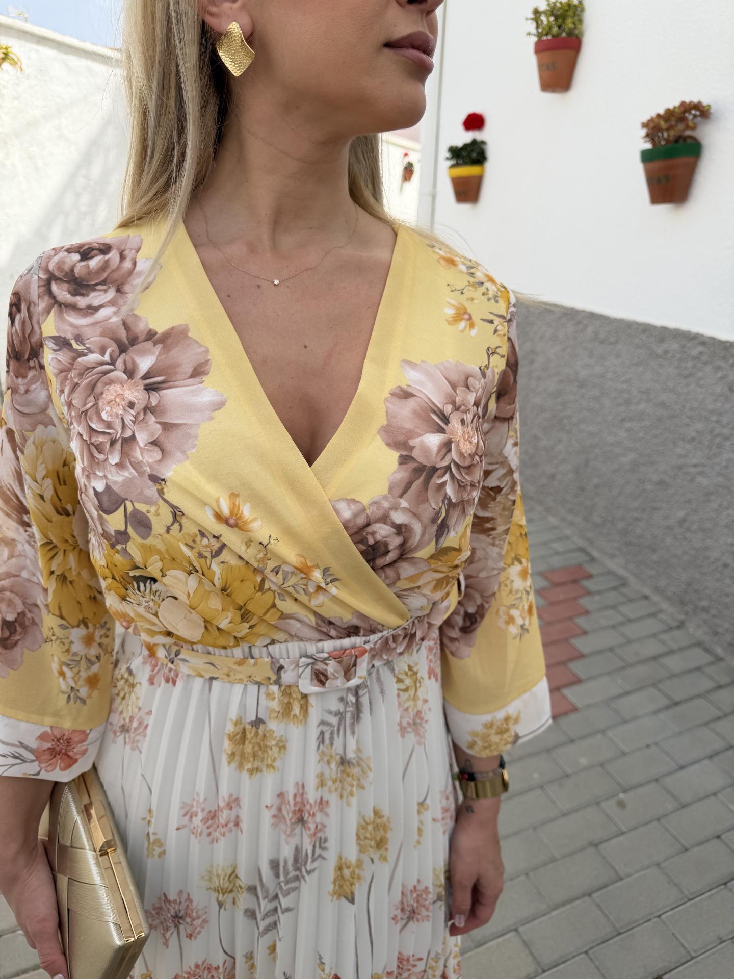 Vestido Midi Floral Elegante para Invitadas Amarillo