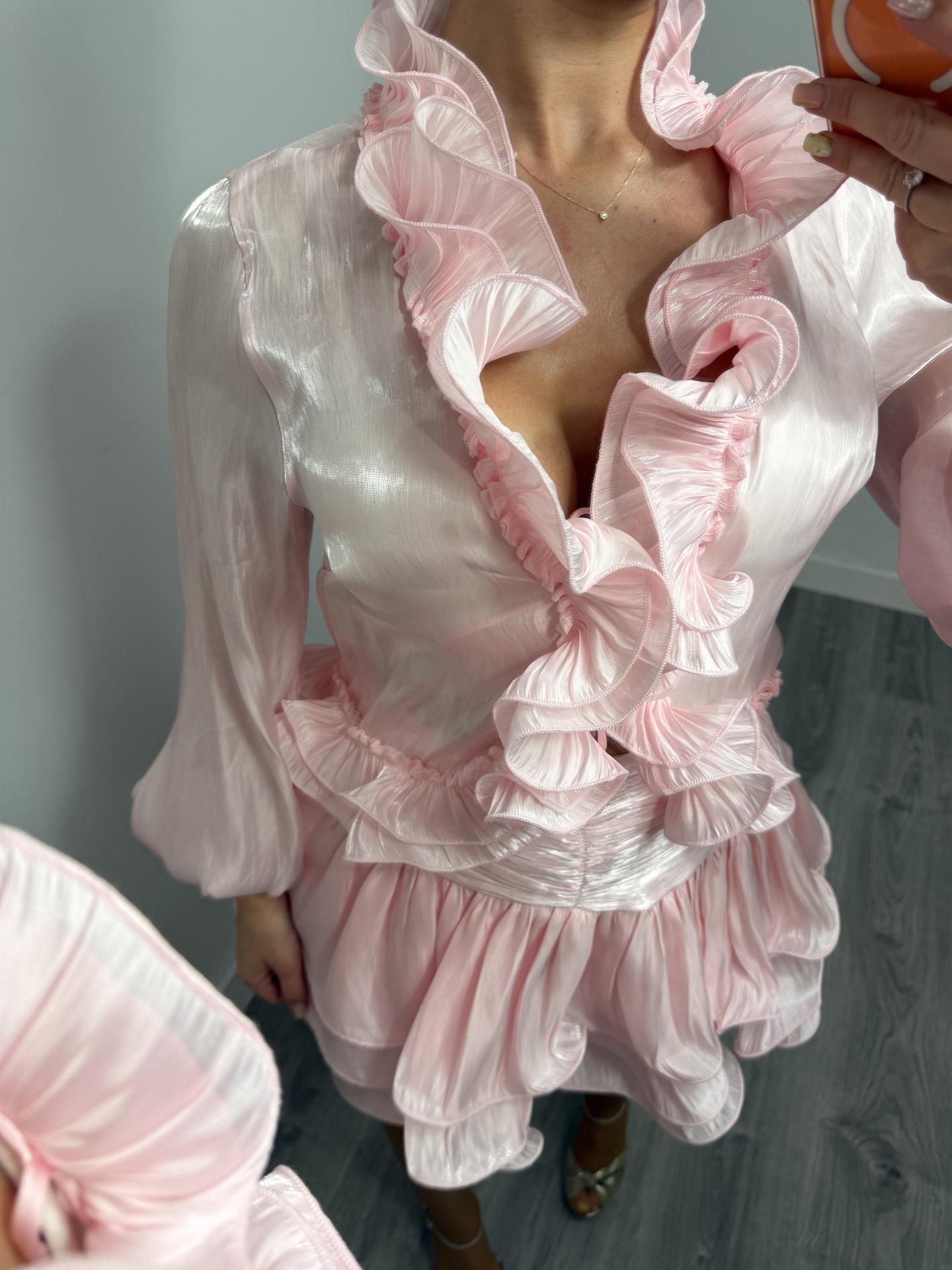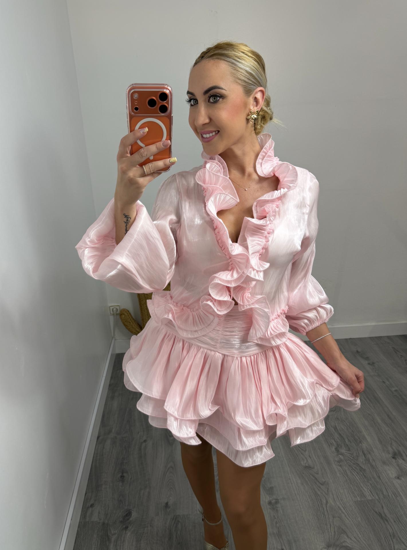 Conjunto Rosa Satinado con Volantes Mujer | Amore