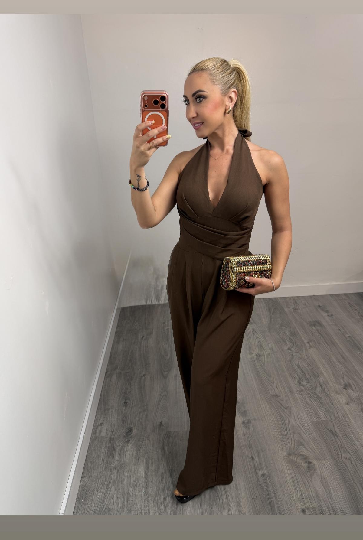Mono Halter Mujer Elegante con Cintura Elástica y Pierna Ancha | Malika Marrón