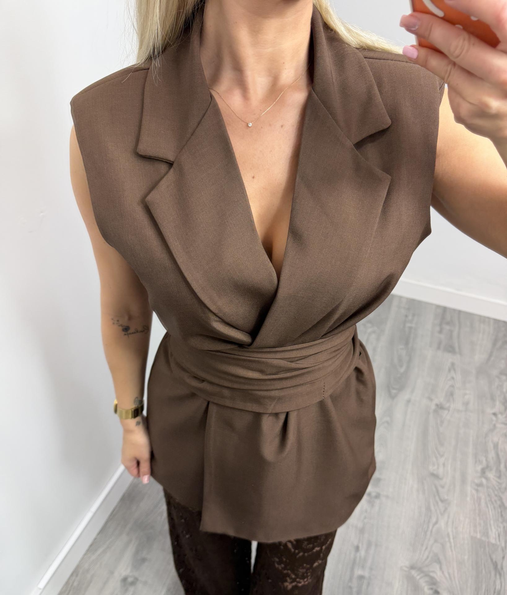Descubre nuestro conjunto elegante marrón para mujer, una opción sofisticada y moderna perfecta para eventos, cenas, fiestas o looks especiales. Este dos piezas incluye un chaleco cruzado sin mangas con cinturón ajustado que estiliza la cintura y realza la figura, combinado con un pantalón largo de encaje semitransparente que aporta un toque exclusivo y femenino.