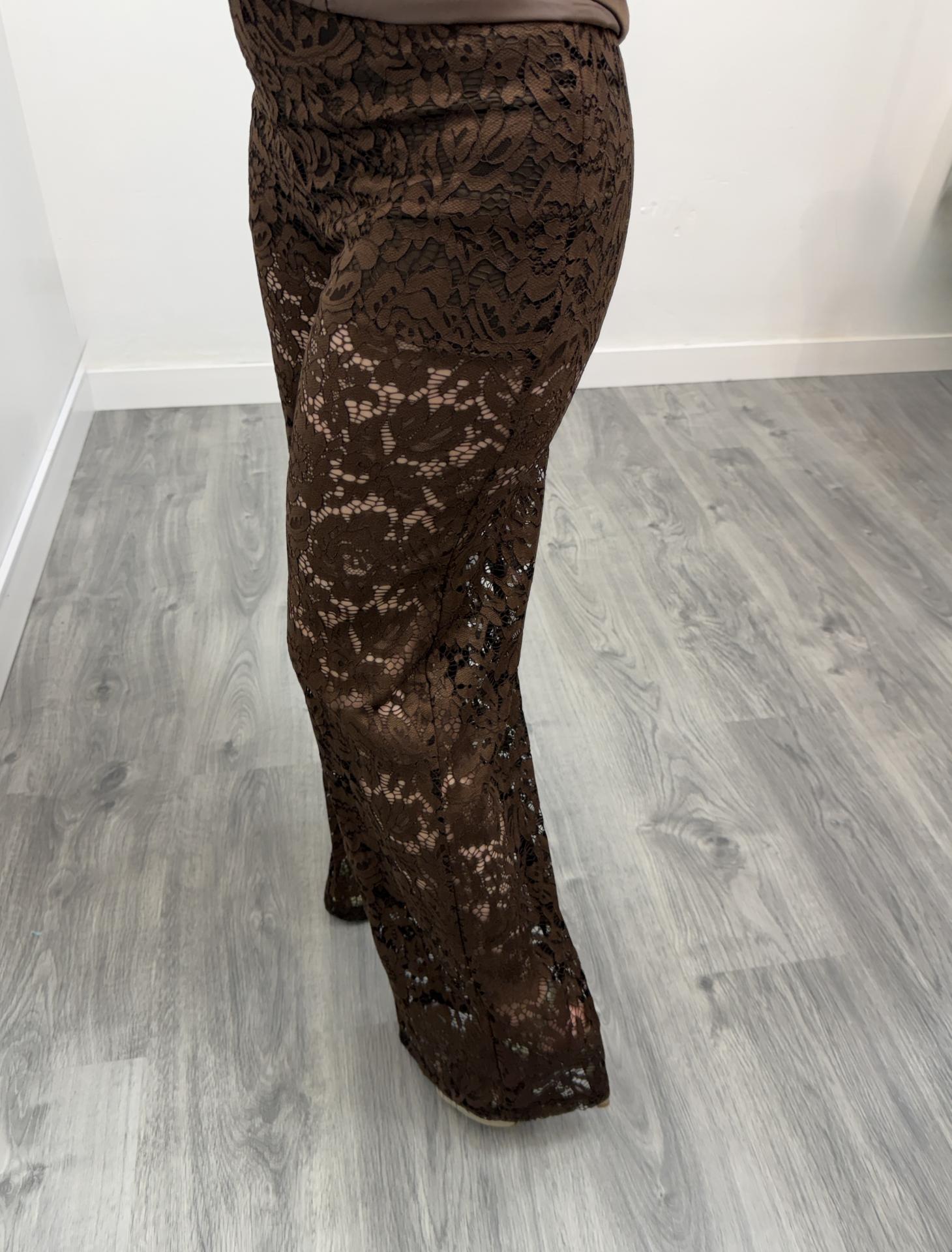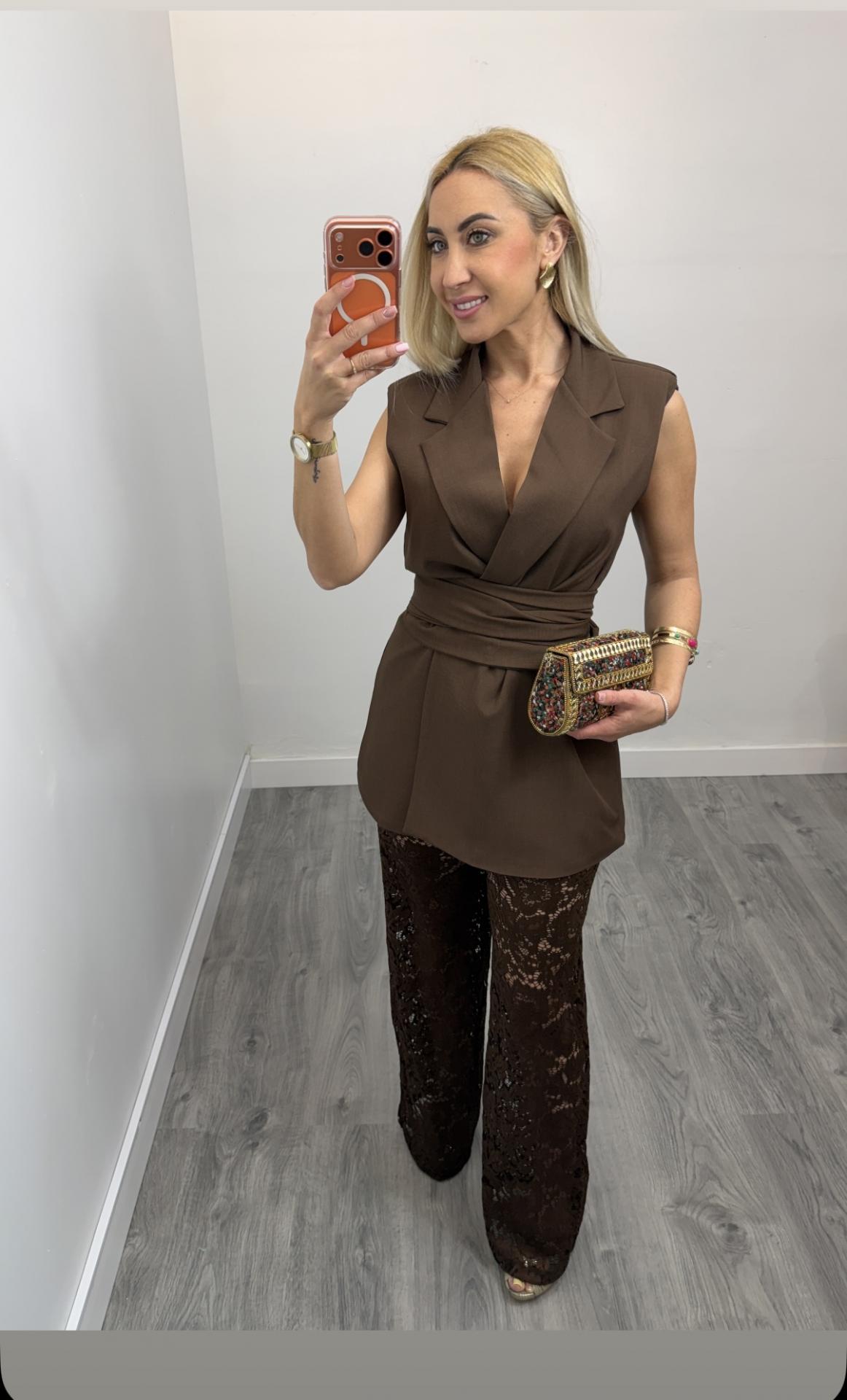 Conjunto Elegante Marrón para Mujer con Chaleco Cruzado y Pantalón de Encaje |